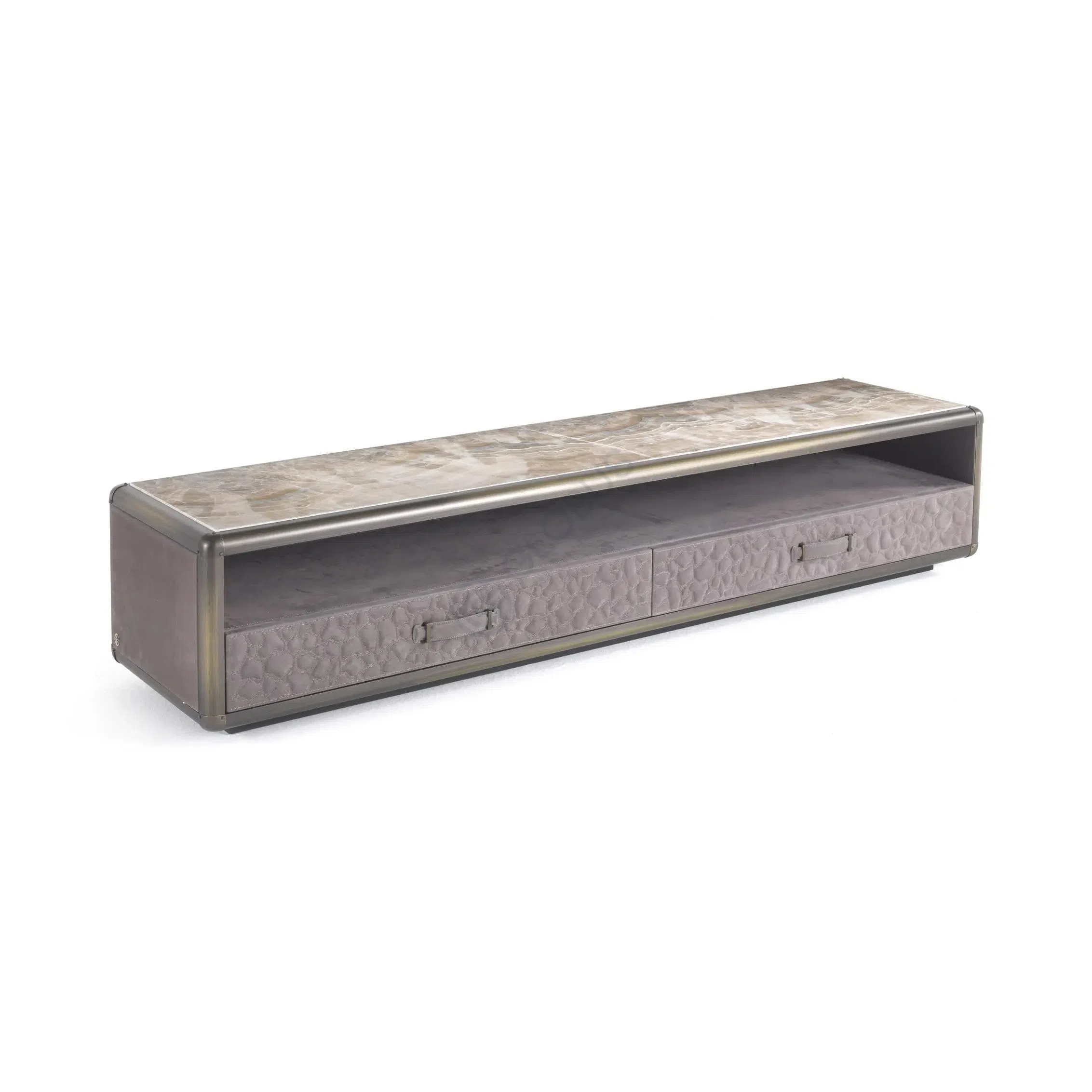 This chest of drawers presents a sophisticated design, combining rich textures and clean lines. It features a deep green leather finish that wraps the rectangular forms of the drawers, offering a tactile and luxurious feel. Complementing the leather, the edges are framed with polished stainless steel, providing a subtle metallic gleam and defining the geometric shape of each section.