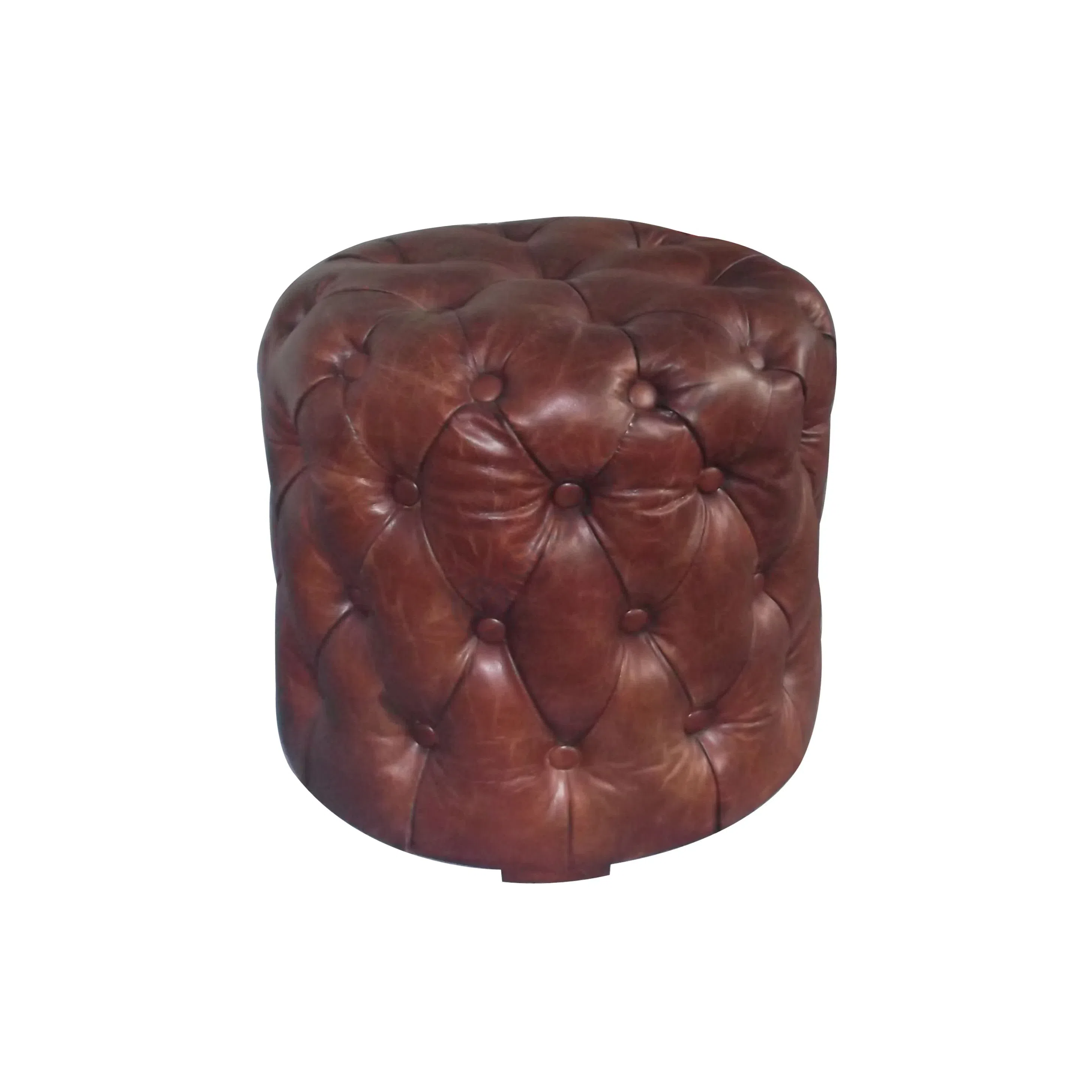This pouf presents a timeless tufted design, offering a substantial round form upholstered in durable PU. The rich, aged brown finish enhances its classic character, with deep buttoning creating a visually striking texture across the entire piece. It is constructed with a solid wood frame, providing a stable and lasting foundation.