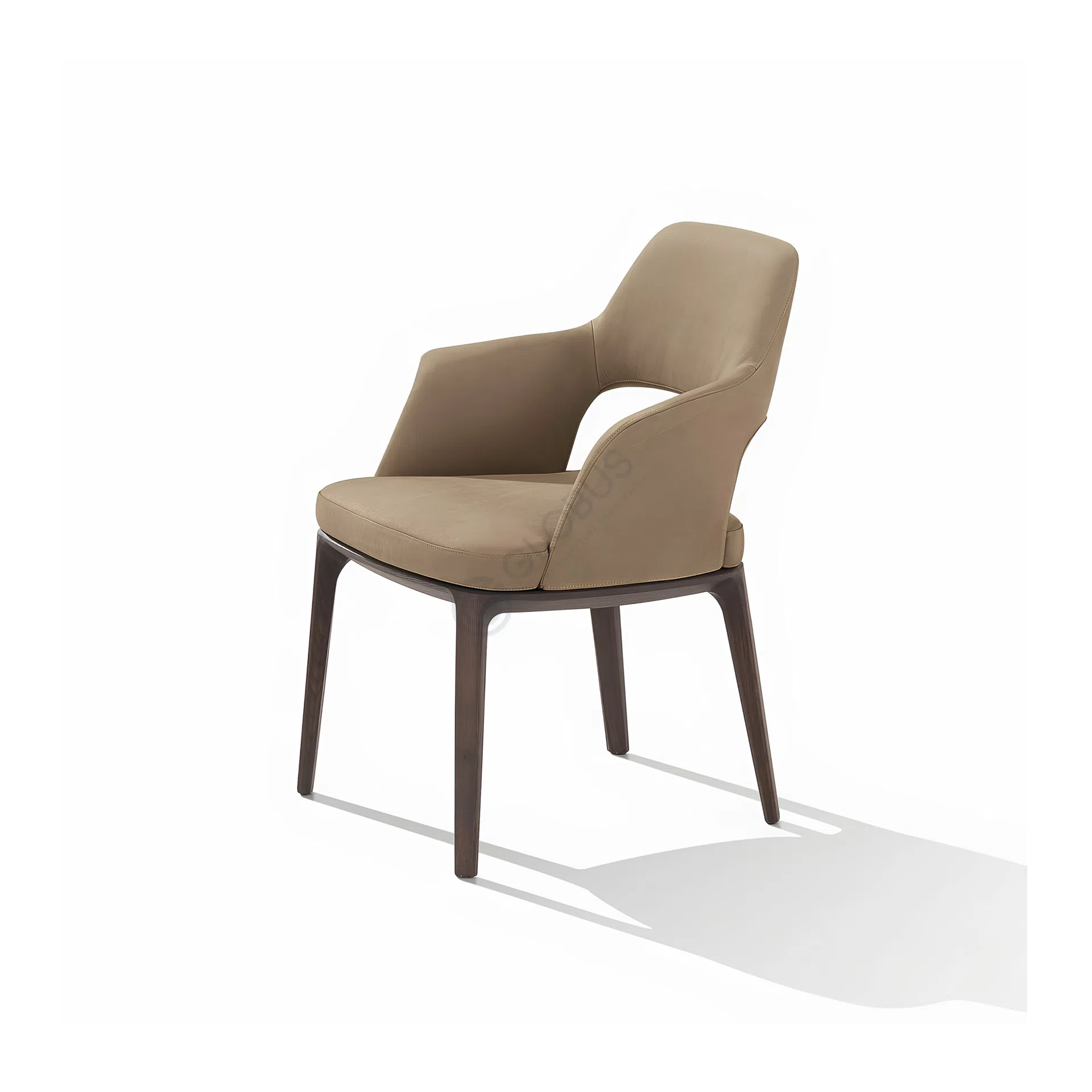 The chair features a slightly curved seat and backrest, upholstered in high-quality textile for a comfortable seating experience. The thoughtful cut-out detail in the backrest adds a contemporary touch while maintaining ergonomic support.