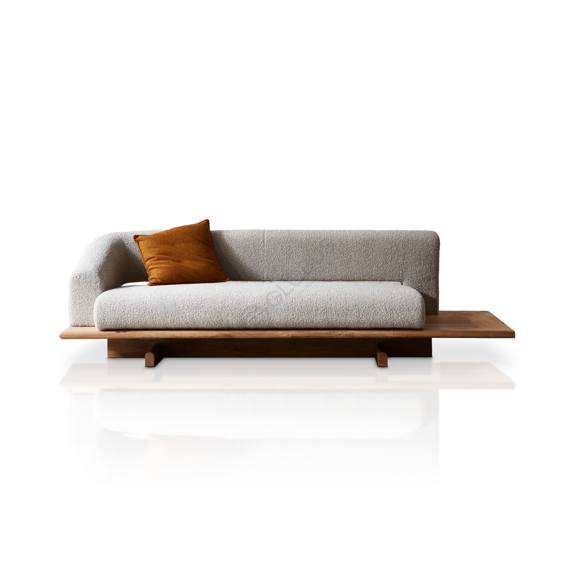 This pouf embodies a modern eco-style, bringing organic elements into contemporary design. The combination of the soft, rounded textile form and the angular, natural wood structure offers a balanced aesthetic that feels both grounded and elegant.