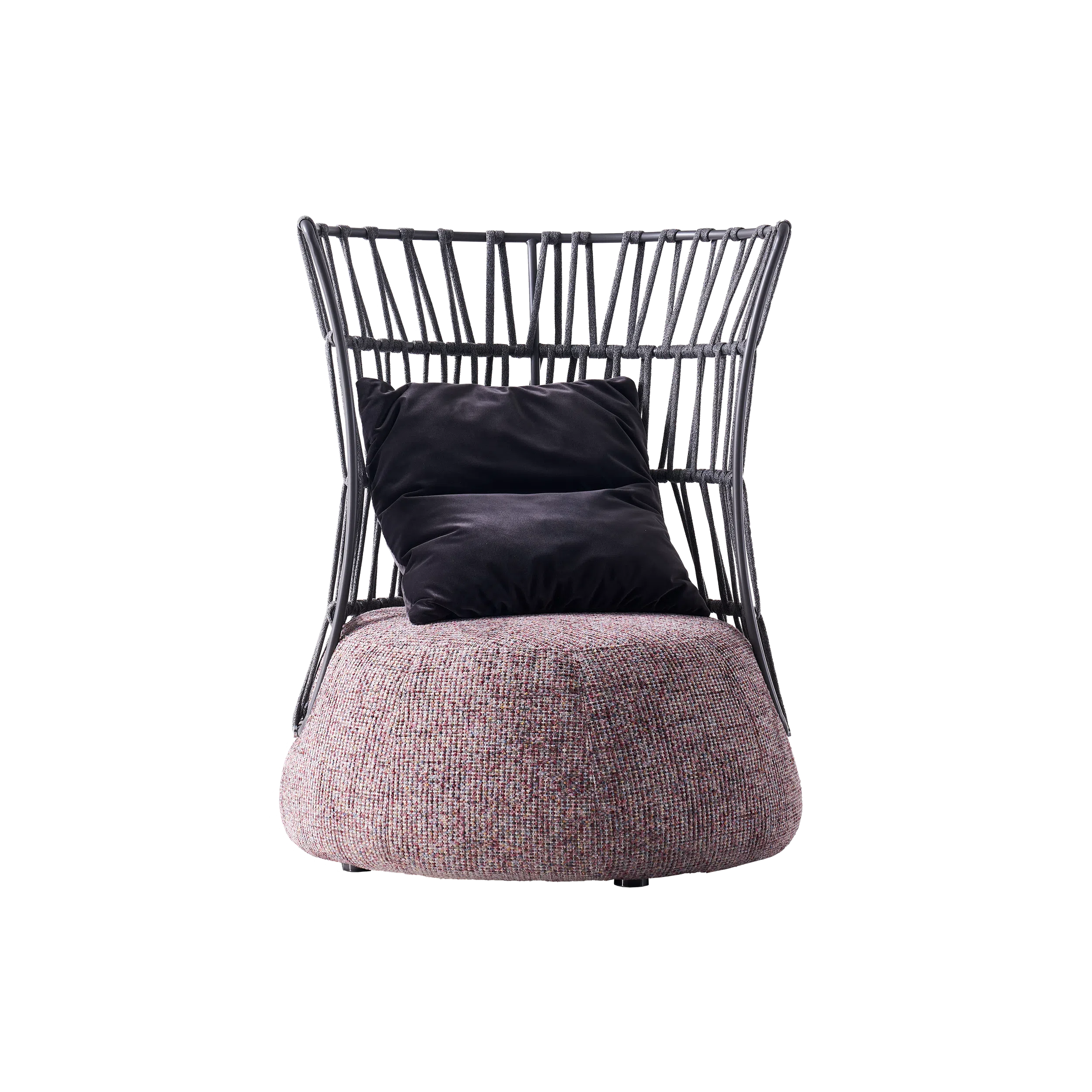 The structure incorporates carbon steel for stability, while the uniquely shaped armrests are detailed with woven rope, adding a touch of organic texture and visual interest. Inside, a plush feather filling contributes to the deep comfort and relaxed feel of the seating.