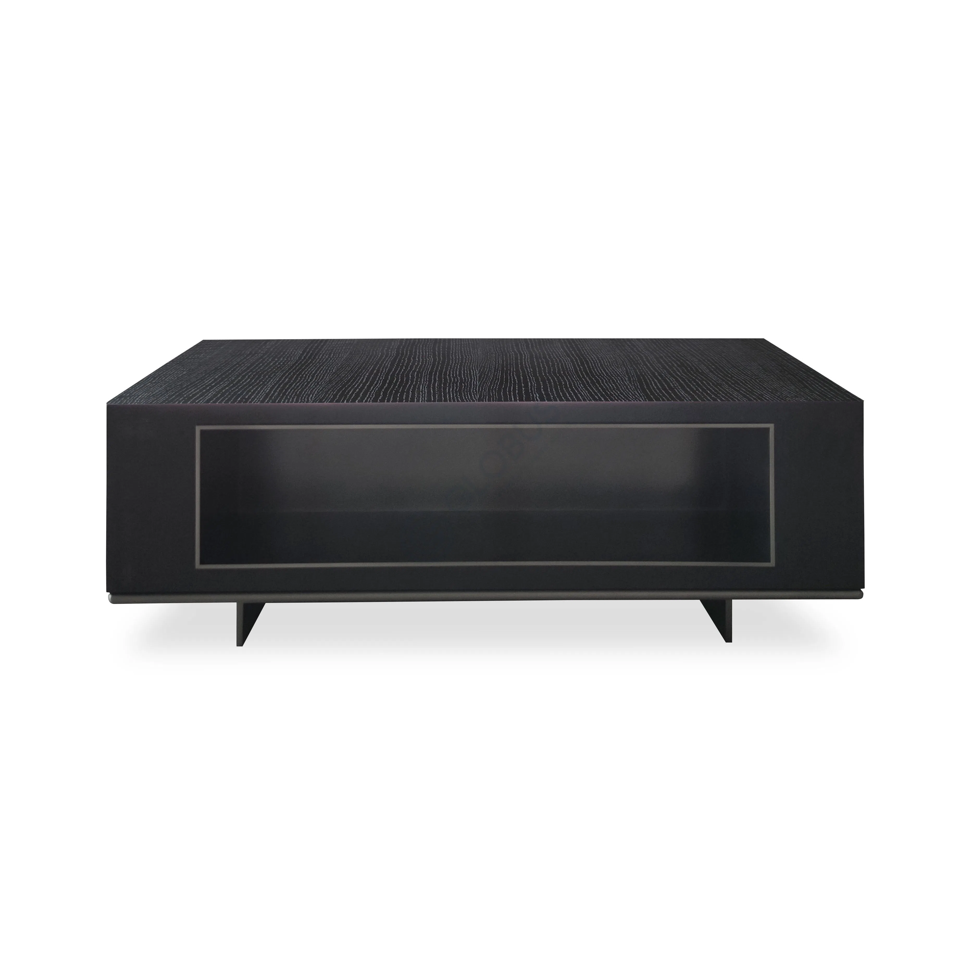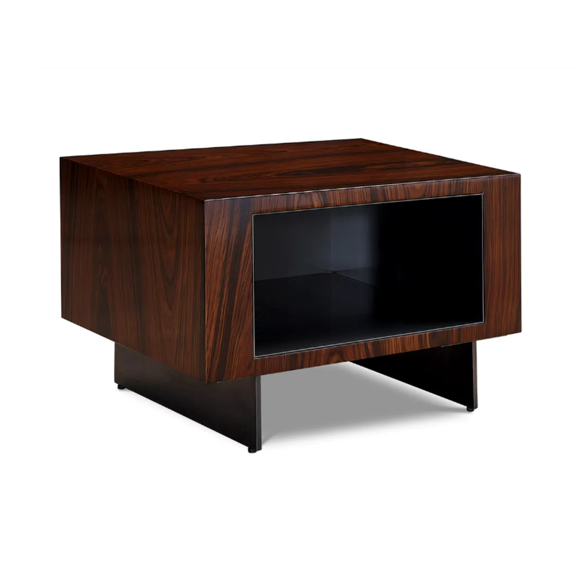 A low-profile ottoman with a clean rectangular form upholstered in warm brown textile. The top surface features subtle channel stitching that adds a refined touch, while the smooth sides and softly rounded corners maintain a modern silhouette. A slim solid wood base in a deep finish provides a sturdy platform and discreet visual contrast.