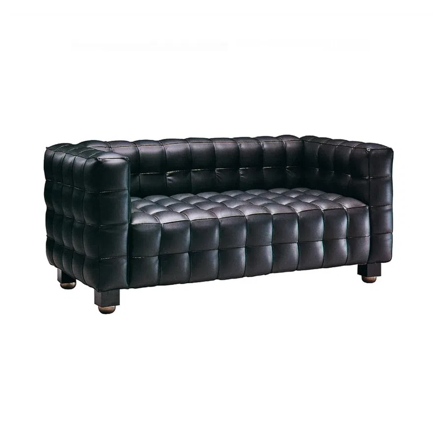 A cube-shaped armchair upholstered in warm brown textile features uniform grid stitching that wraps around seat, back and armrests. The consistent height of the armrests and backrest creates a harmonious silhouette, while the generous seat depth invites comfortable seating.