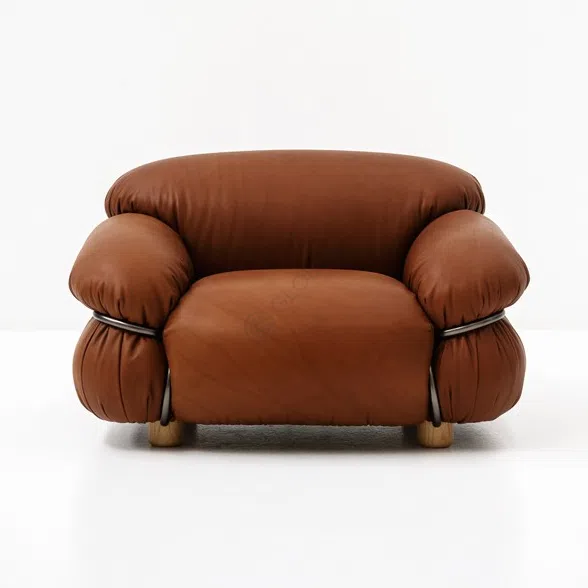 The upholstery is a high-quality, richly textured textile that adds depth and tactile warmth to the design. A defining characteristic is the artful gathering of the fabric at the armrests, which are elegantly cinched by a refined band. This thoughtful detail introduces a touch of softness and visual interest, complementing the clean lines of the single, deep seat cushion and the enveloping backrest.