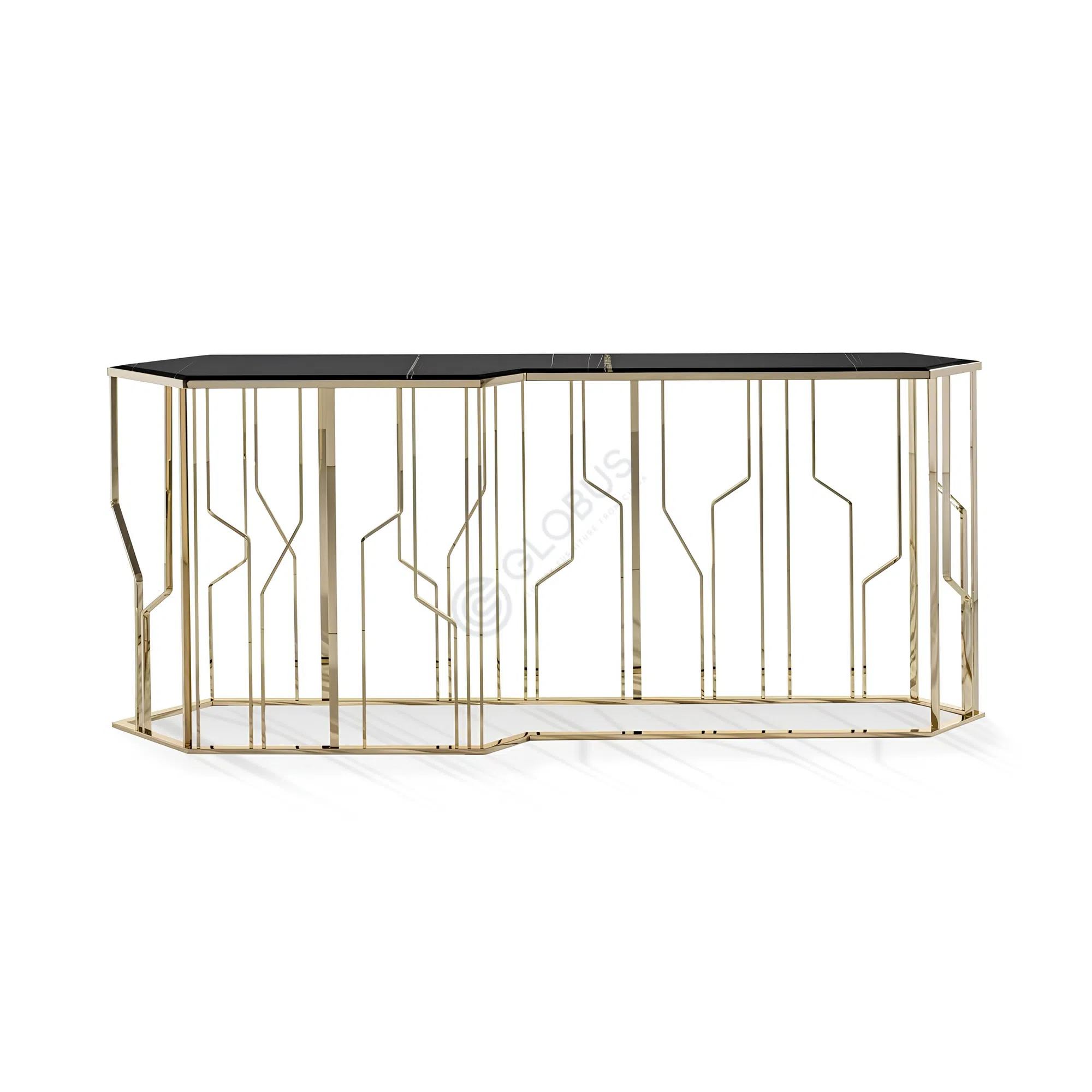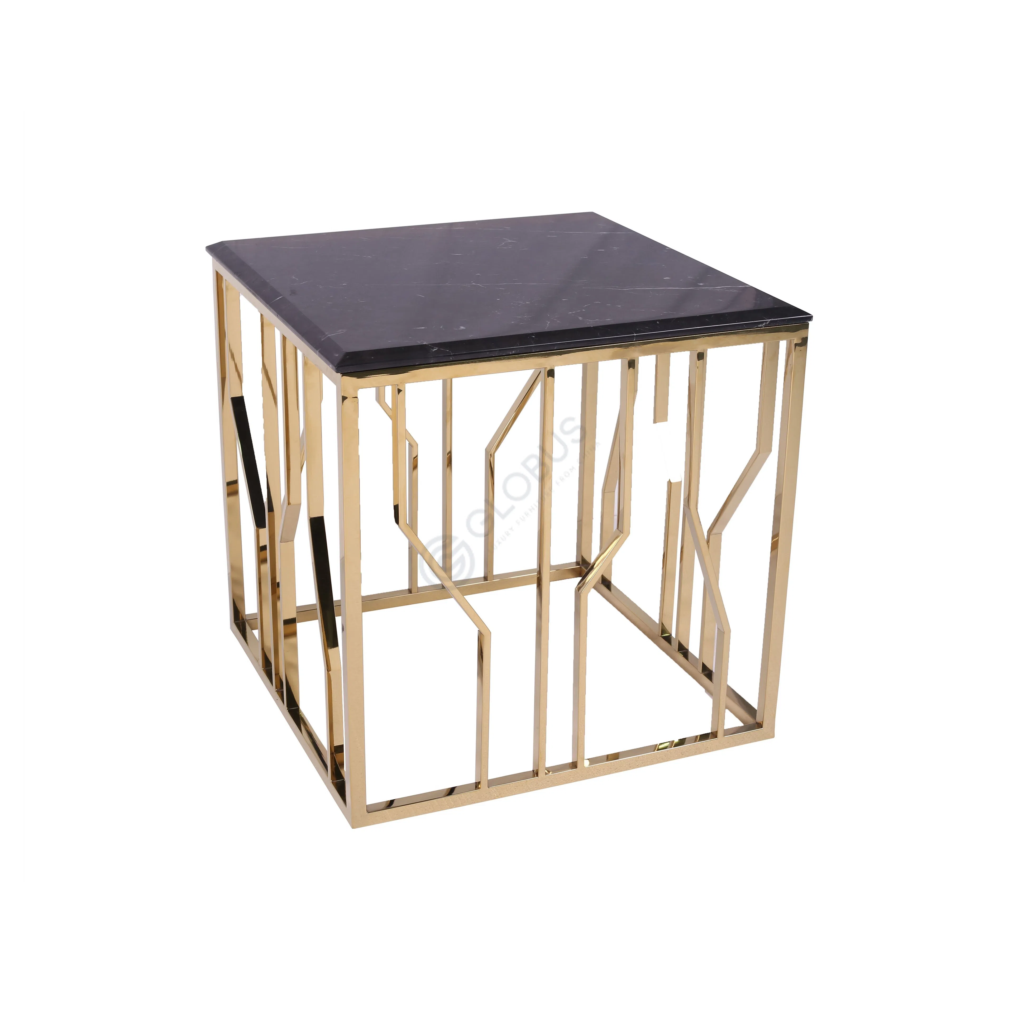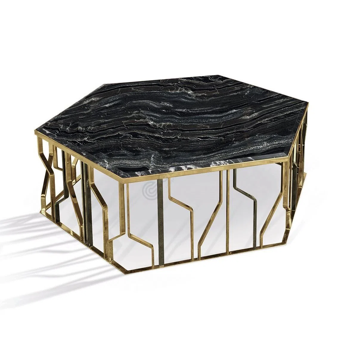 The combination of the cool, reflective stainless steel and the warm, patterned marble creates a sophisticated contrast. This table serves as a statement piece, blending artistry with function to elevate your interior space.