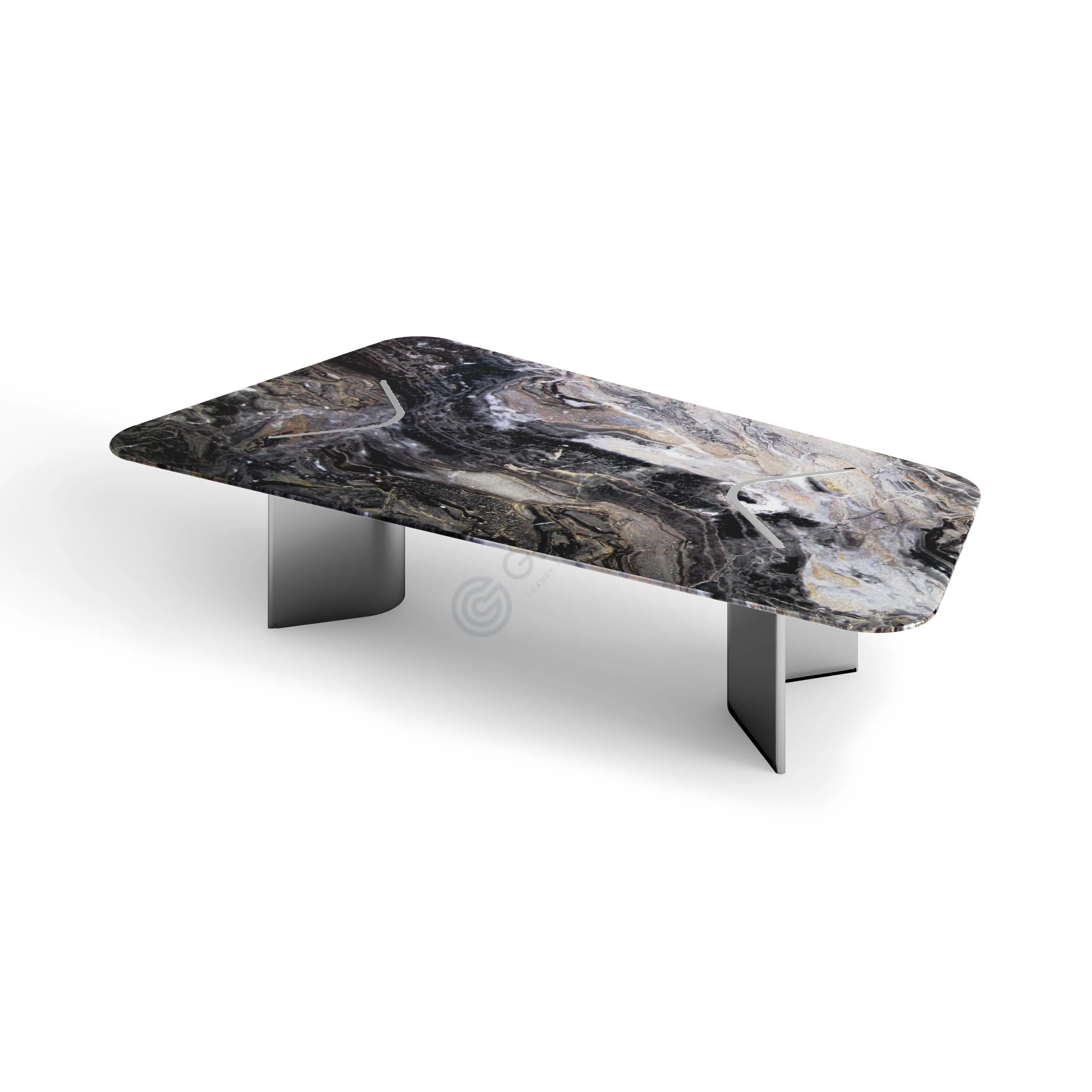 Supporting the exquisite top is a base made from polished stainless steel. The base features four sculptural legs with a curved form, creating a clean, contemporary profile. The reflective finish of the steel adds a touch of brilliance, complementing the natural texture of the marble.