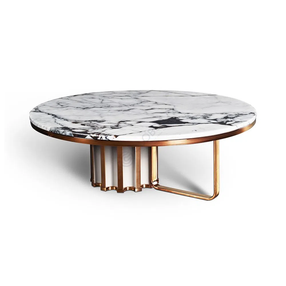 The table stands with poise on a base ingeniously crafted from polished stainless steel, its glimmering finish providing a luscious contrast to the marble. This sturdy and stable foundation also features subtle leather accents that bring a touch of warmth and texture, creating an inviting atmosphere.
