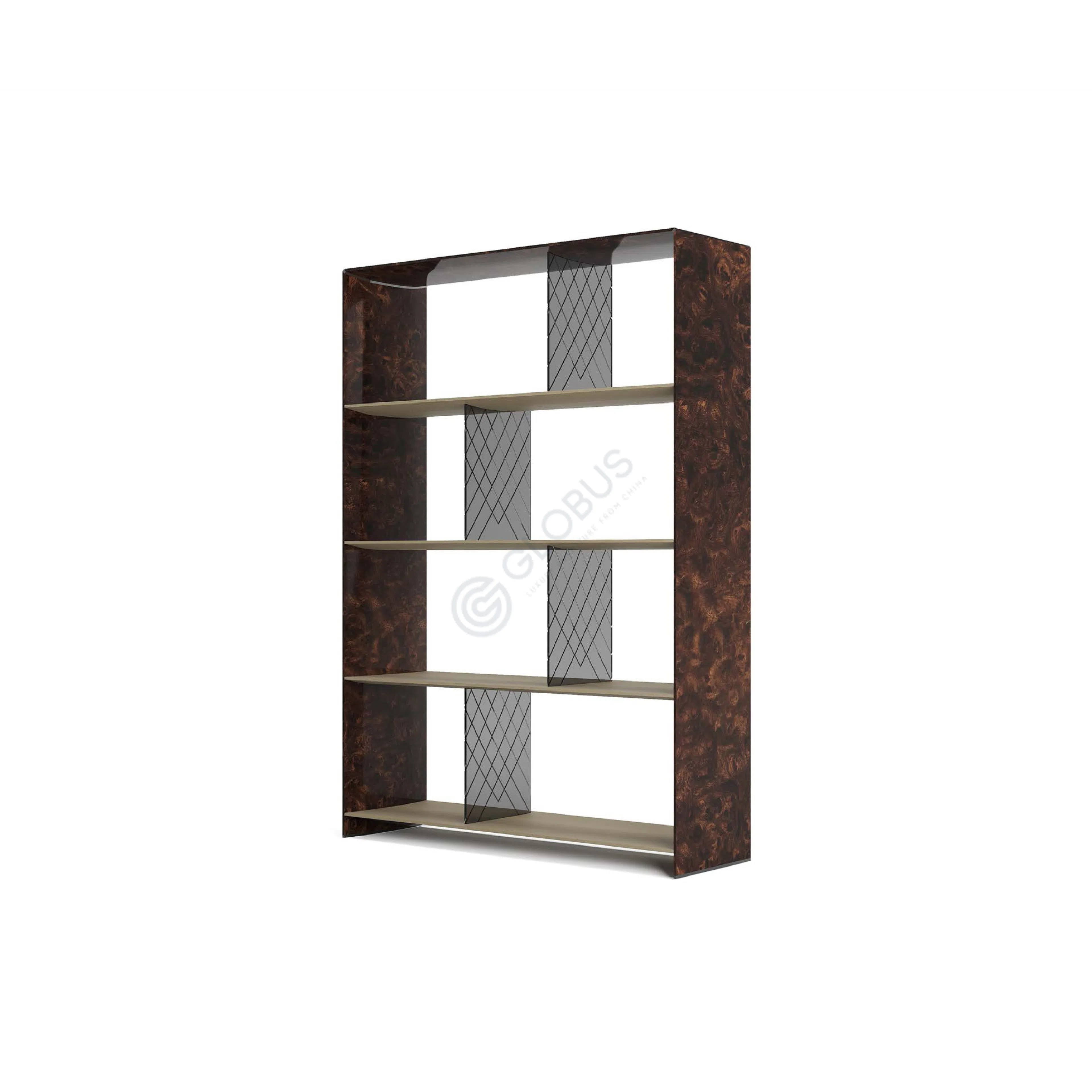 This elegant bookshelf provides a sophisticated structure for displaying your cherished books and objects. It presents a thoughtful combination of dark finishes and rich, natural elements, designed to enhance any refined interior space.