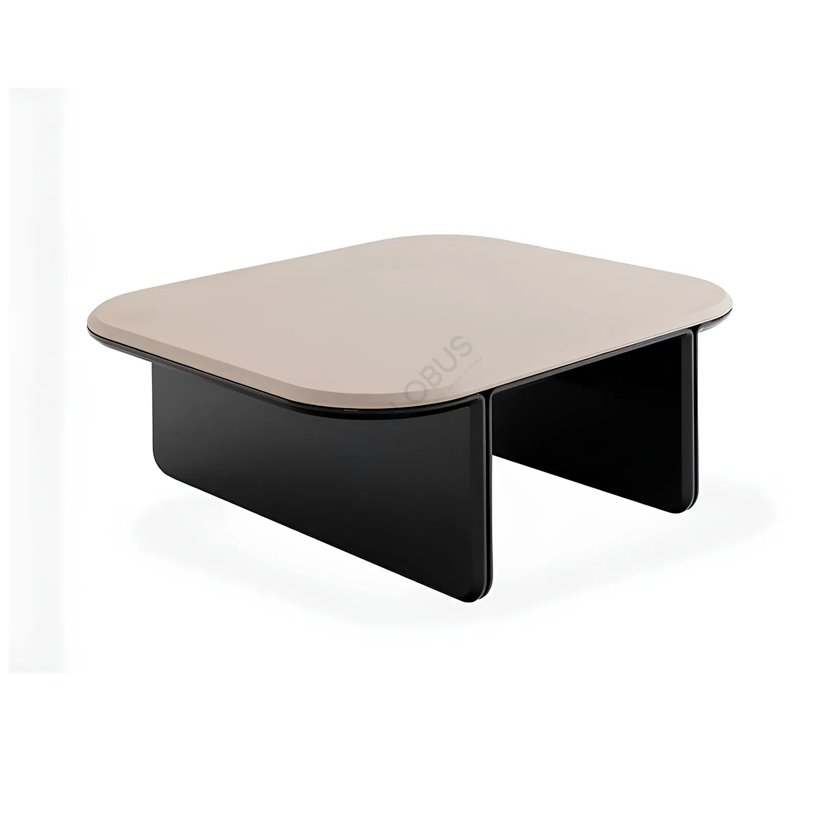 A modern side table featuring a striking top crafted with natural veneer. The rich, dark wood grain is showcased beautifully under a high-gloss finish, creating a surface that is both visually deep and luxurious. Its gently rounded square shape adds a soft touch to its contemporary design.