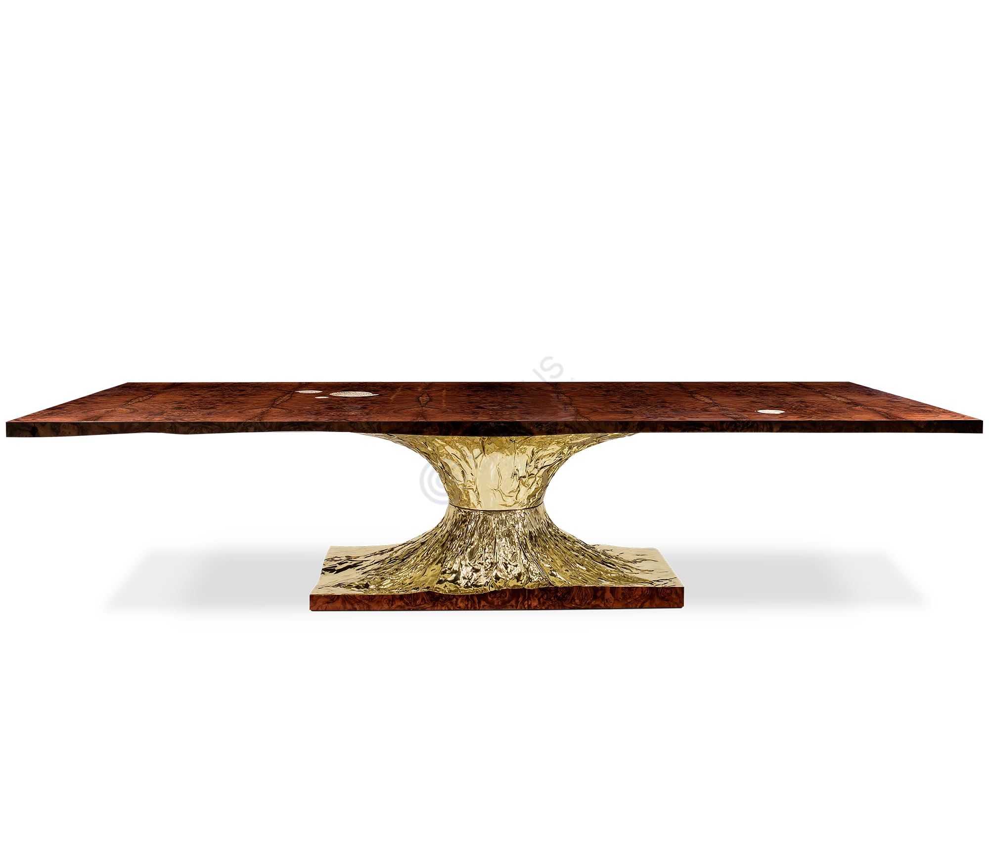 Resting atop this sculptural base is a slender, elegant surface of solid brass. The design achieves a visual balance, creating a piece that feels both substantial and refined.