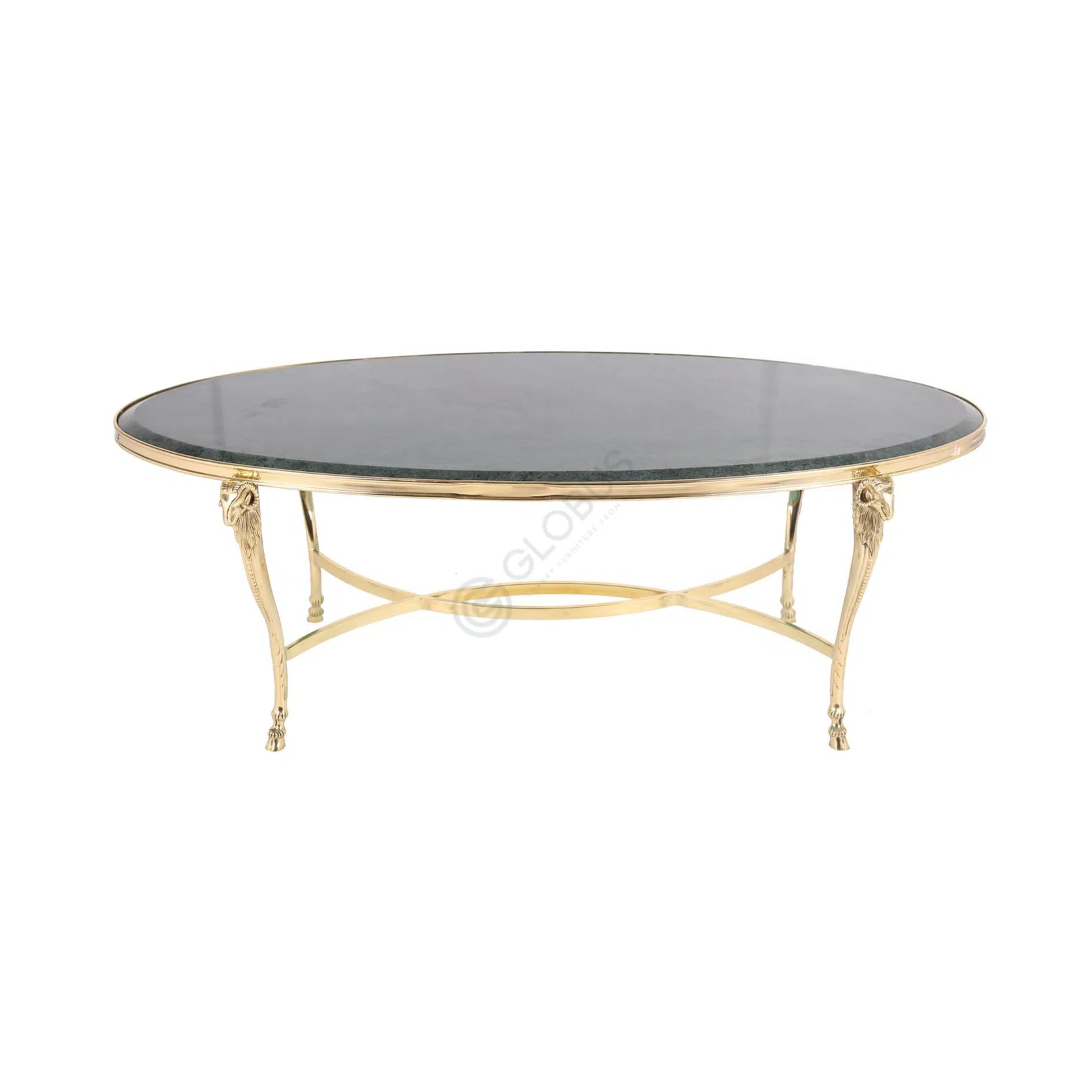 The brass base features gracefully curved legs that rise from decorative feet, meeting a practical circular stretcher ring before sweeping upwards to support the marble top. Subtle decorative accents are integrated into the frame, enhancing the table's refined aesthetic and echoing classic architectural details. This piece serves not just as a functional surface but as a sculptural element within a room.