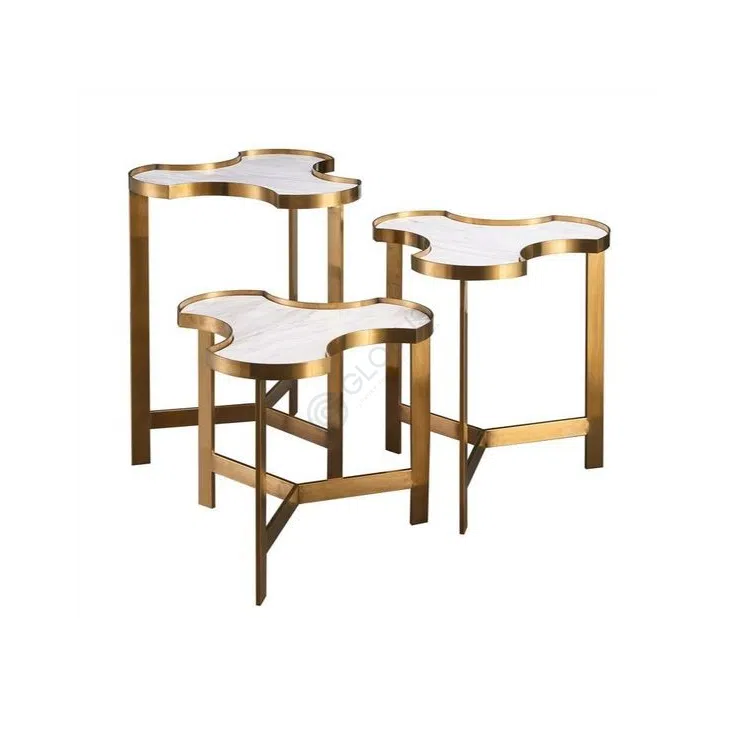 A distinctive side table featuring a uniquely shaped top crafted from natural marble. The elegant marble surface displays its inherent patterns and subtle variations, offering a touch of organic beauty.