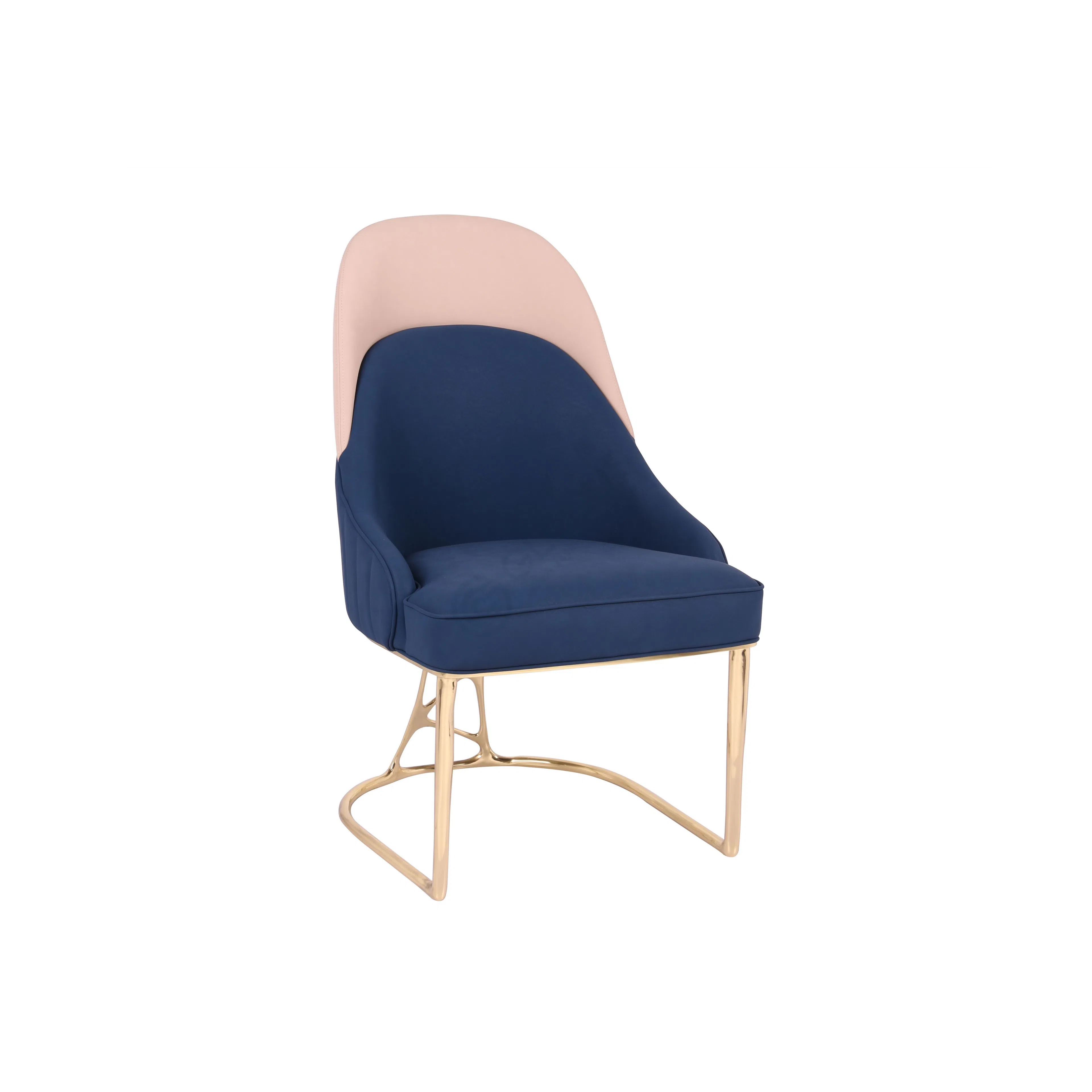 The chair is supported by a beautifully curved base and integrated arms fashioned from polished brass. This gleaming metal structure provides both stability and a bold visual statement, perfectly capturing the essence of the Art Deco style while ensuring comfortable support for dining.