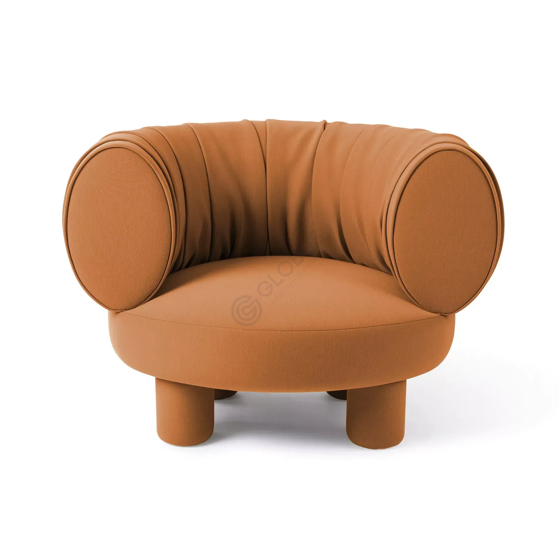 This sofa presents a distinct sculptural form, defined by its continuous, gathered backrest that seamlessly flows into rounded arms. The soft pleats create a sense of volume and visual interest, offering a gentle contrast to the clean, smooth line of the generous seat. Its low profile and rounded, sturdy legs establish a grounded yet soft presence.