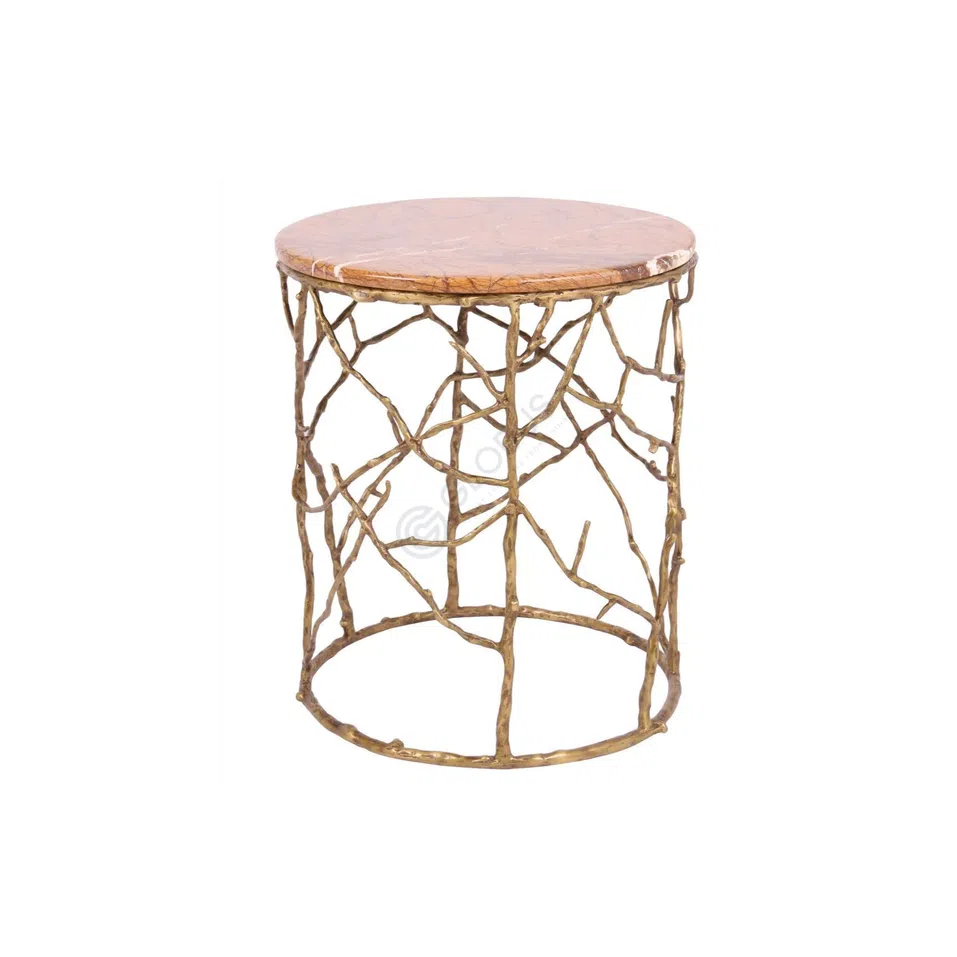 The chair features a distinctive frame crafted from solid brass, presenting an organic, branch-like texture that is both unique and visually appealing. This strong metallic structure supports a generously padded seat and a circular backrest, both upholstered in a rich, deep red textile. The armrests are also thoughtfully padded for added comfort.