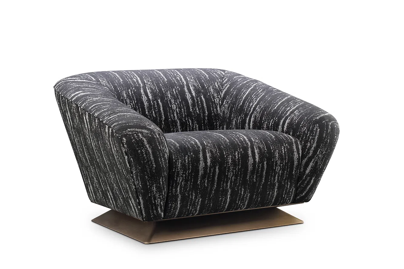 A low-slung modern couch with an asymmetric silhouette, this piece pairs a sculpted wraparound arm with a gently sloped back. The tailored textile upholstery in a textured gray gives soft dimension, while a recessed stainless-steel plinth creates a refined floating effect.