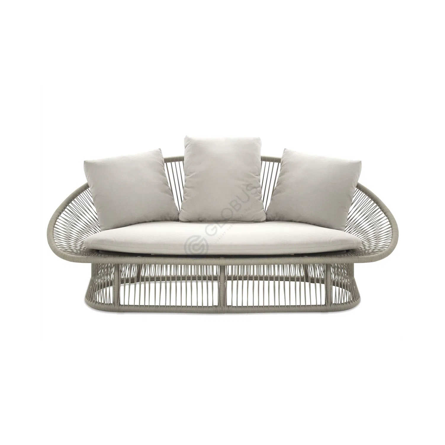 Comfort is central to this piece, featuring plush textile cushions for both the seat and back. The generously sized cushion and supportive pillow are upholstered in a soft, resilient fabric chosen for both comfort and outdoor durability, presented in a calm, neutral palette.