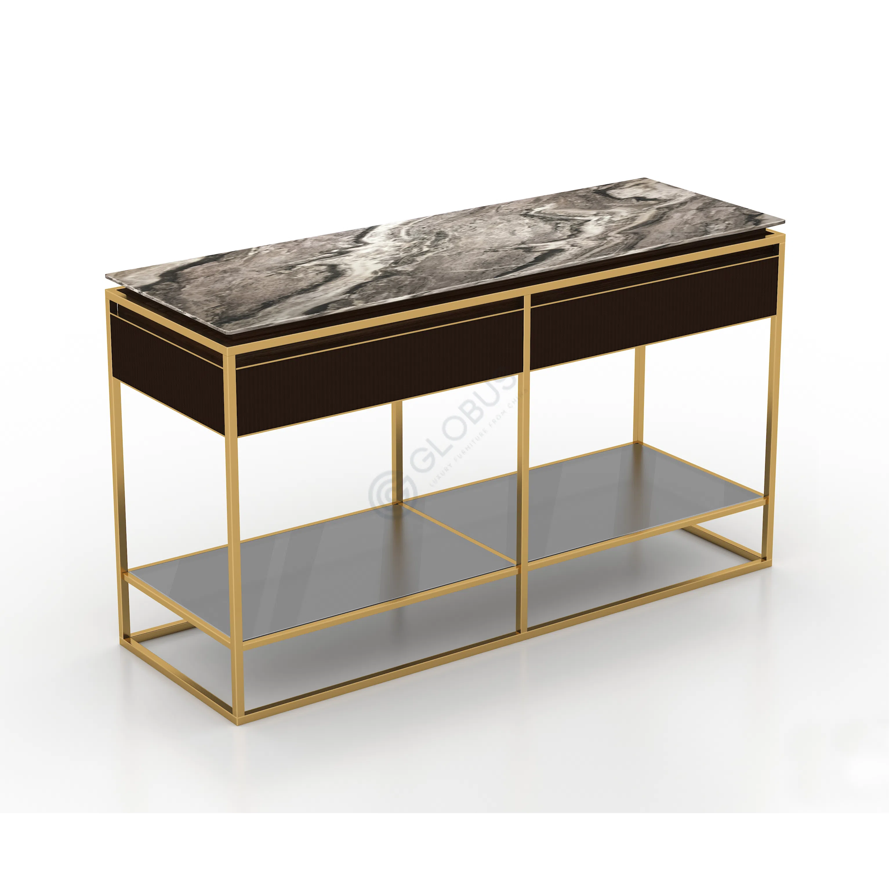 Supporting the upper section is a sleek, geometric frame crafted from metal with a warm brass finish. This golden tone provides a elegant contrast against the darker tones of the marble and wood, enhancing the table's contemporary appeal.
