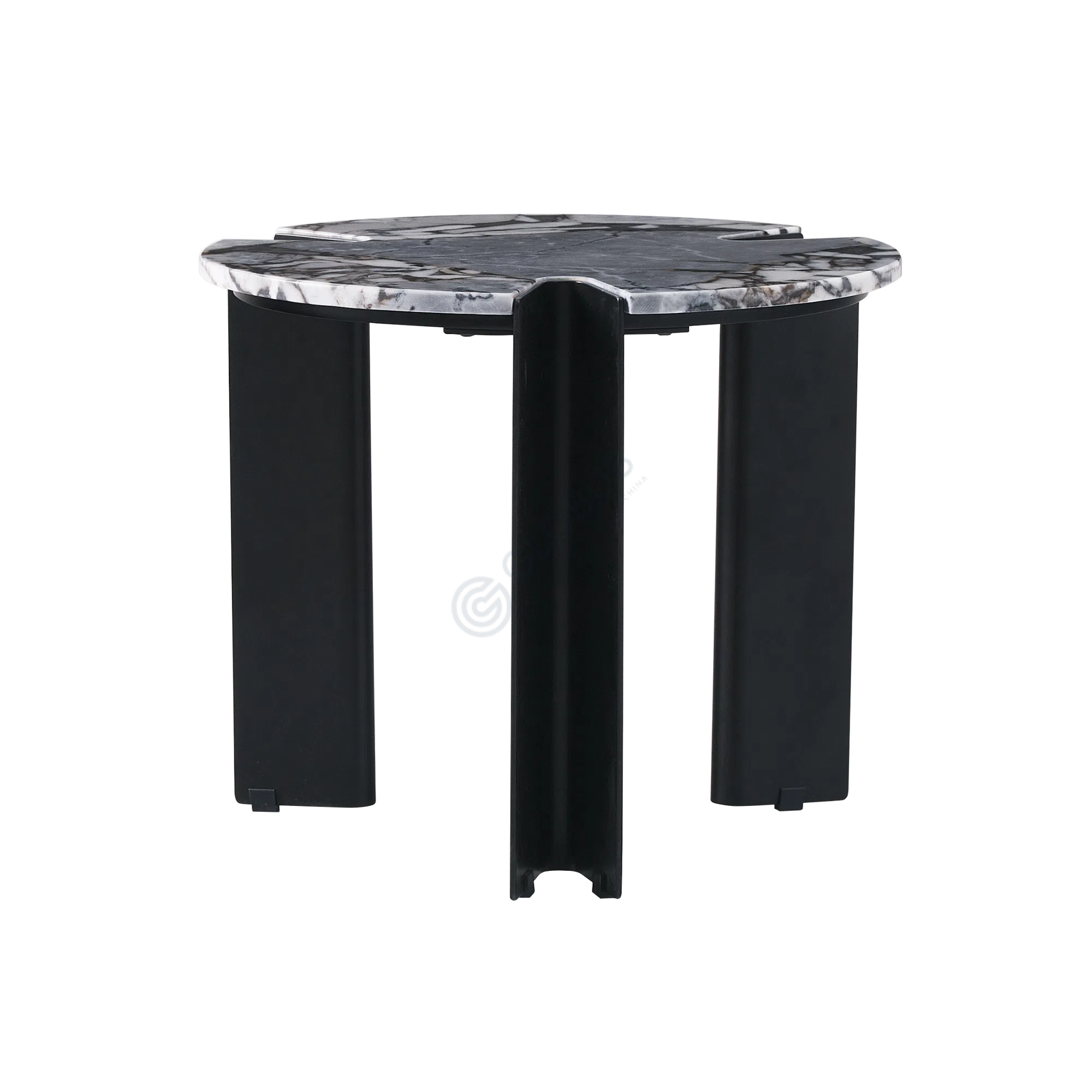 Supporting the stone top is a base made from carbon steel. Finished in a dark tone, the steel is shaped into geometric legs that provide strong support while maintaining an airy, modern look. The clean lines and dark finish of the base offer a sophisticated contrast to the natural patterns of the stone.