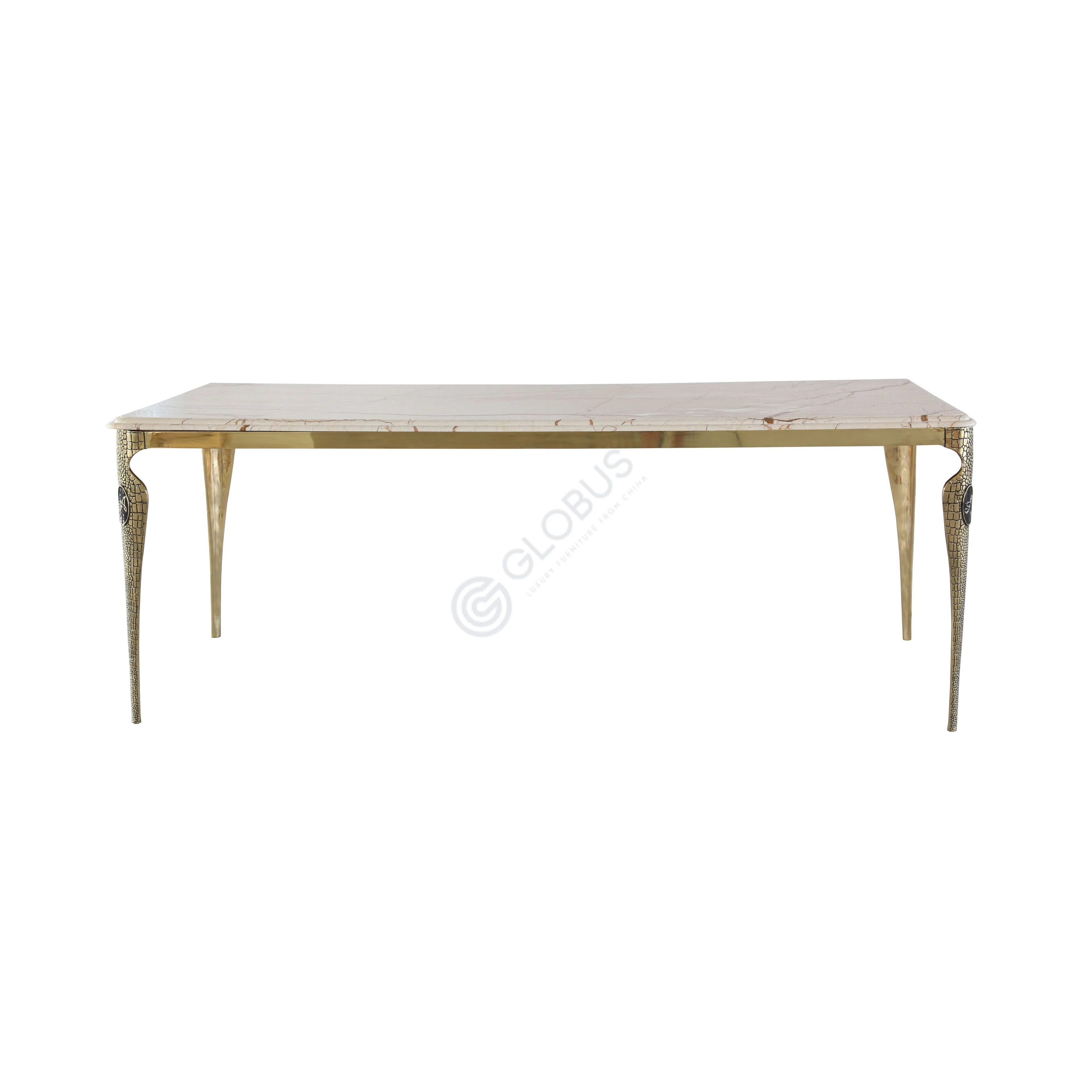 The table features a top crafted from beautiful natural marble. The dark, rich tone of the stone provides a sense of depth and luxury, with subtle variations in its natural pattern that make each table uniquely its own. This elegant surface is both durable and visually appealing.