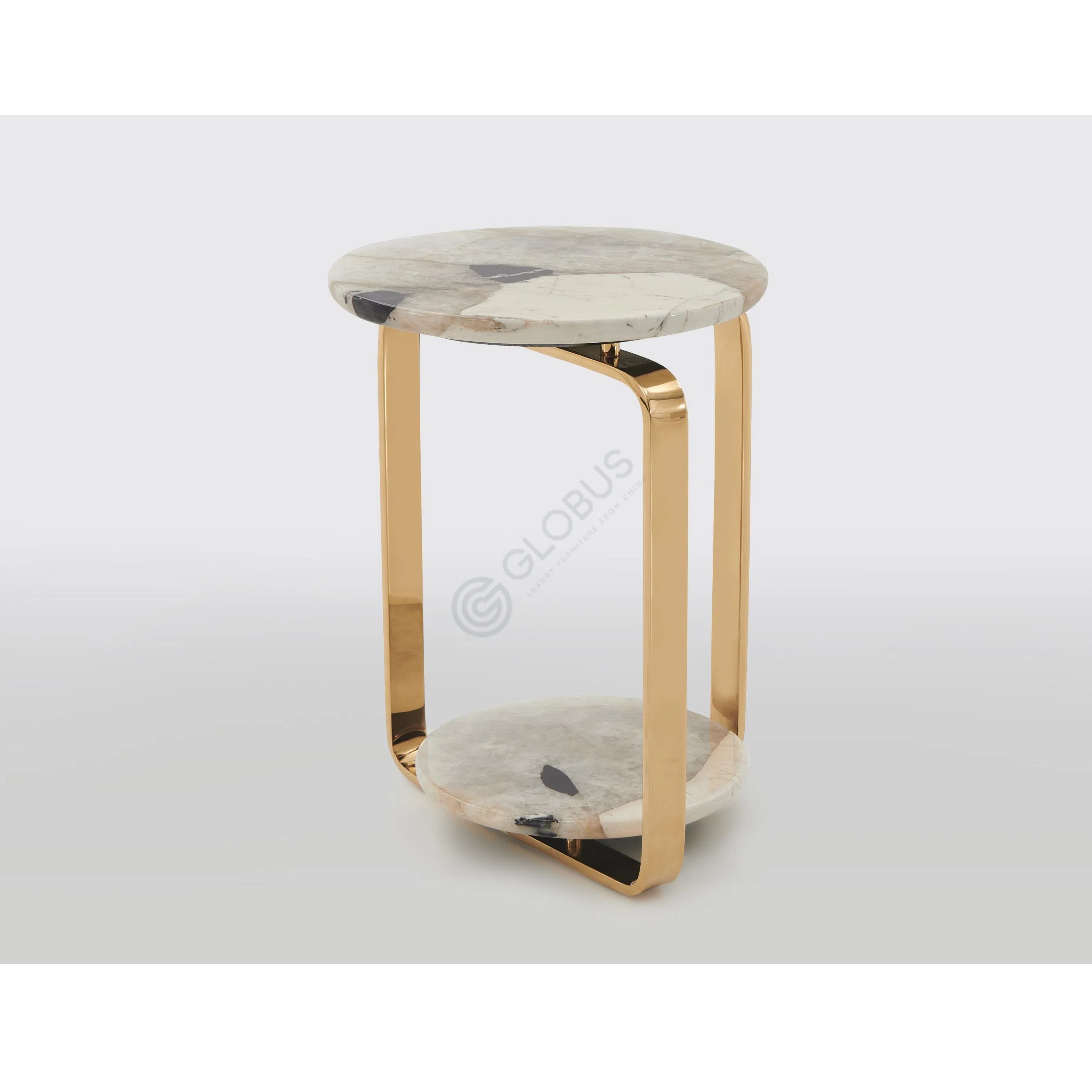 Supporting the marble tiers, a stainless steel frame in a soft metallic sheen provides strength and visual lightness. Vertical supports curve gracefully to cradle both levels, creating an open silhouette that feels both airy and substantial.
