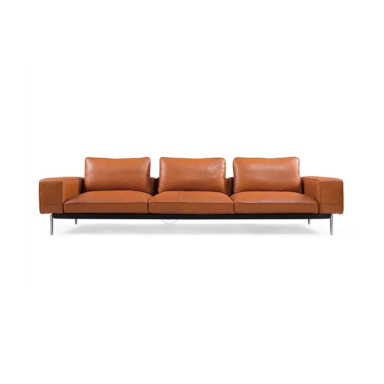 The construction utilizes a robust internal frame built from solid wood and durable plywood, ensuring lasting stability. This sturdy foundation is supported by sleek, minimalist legs crafted from stainless steel and iron, lifting the sofa slightly and contributing to its airy, modern feel.