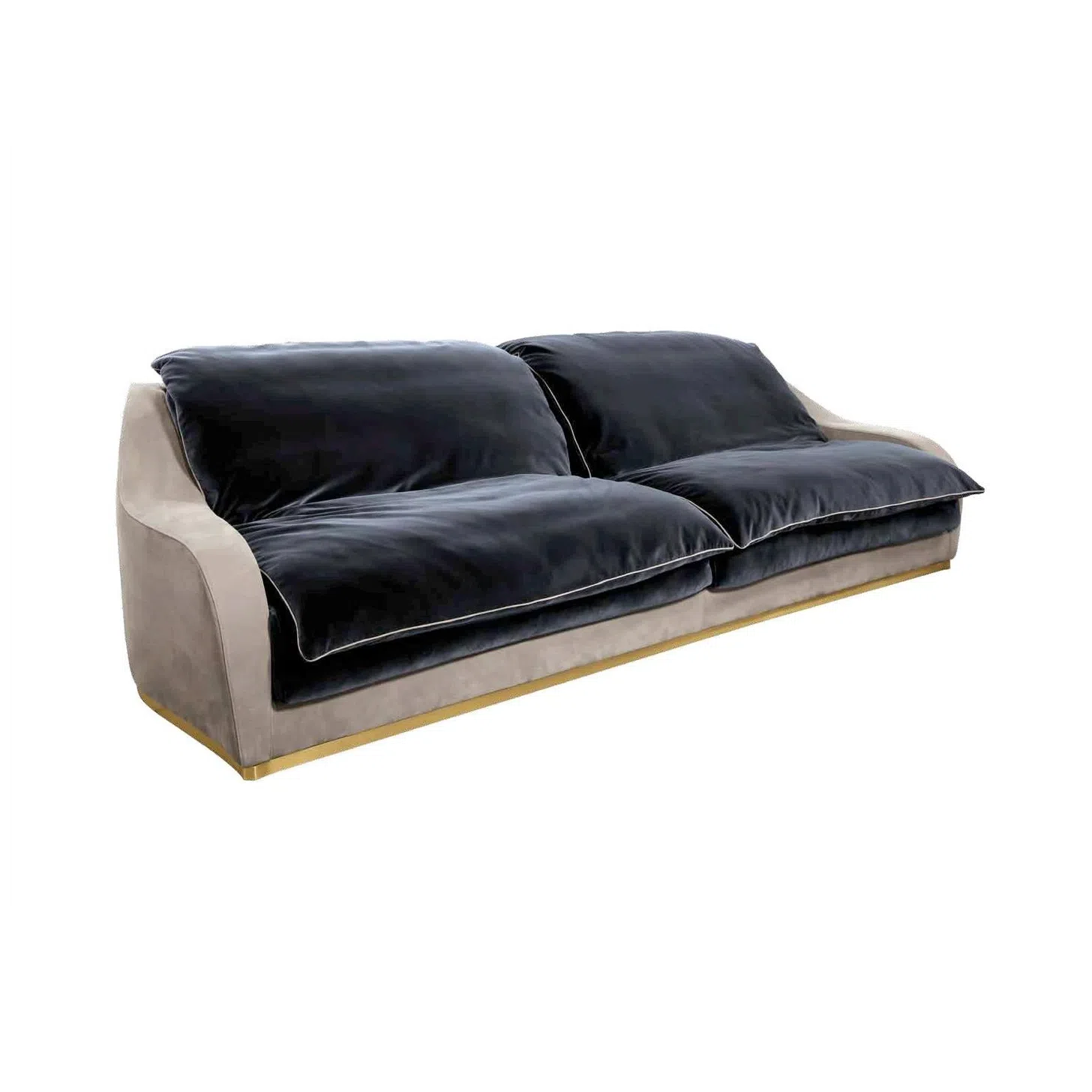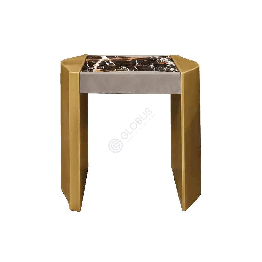 Detailing along the sides incorporates soft suede leather, adding a tactile contrast and enhancing the sophisticated material palette. This combination of natural stone, sleek metal, and supple leather creates a piece that is both visually impressive and finely crafted.