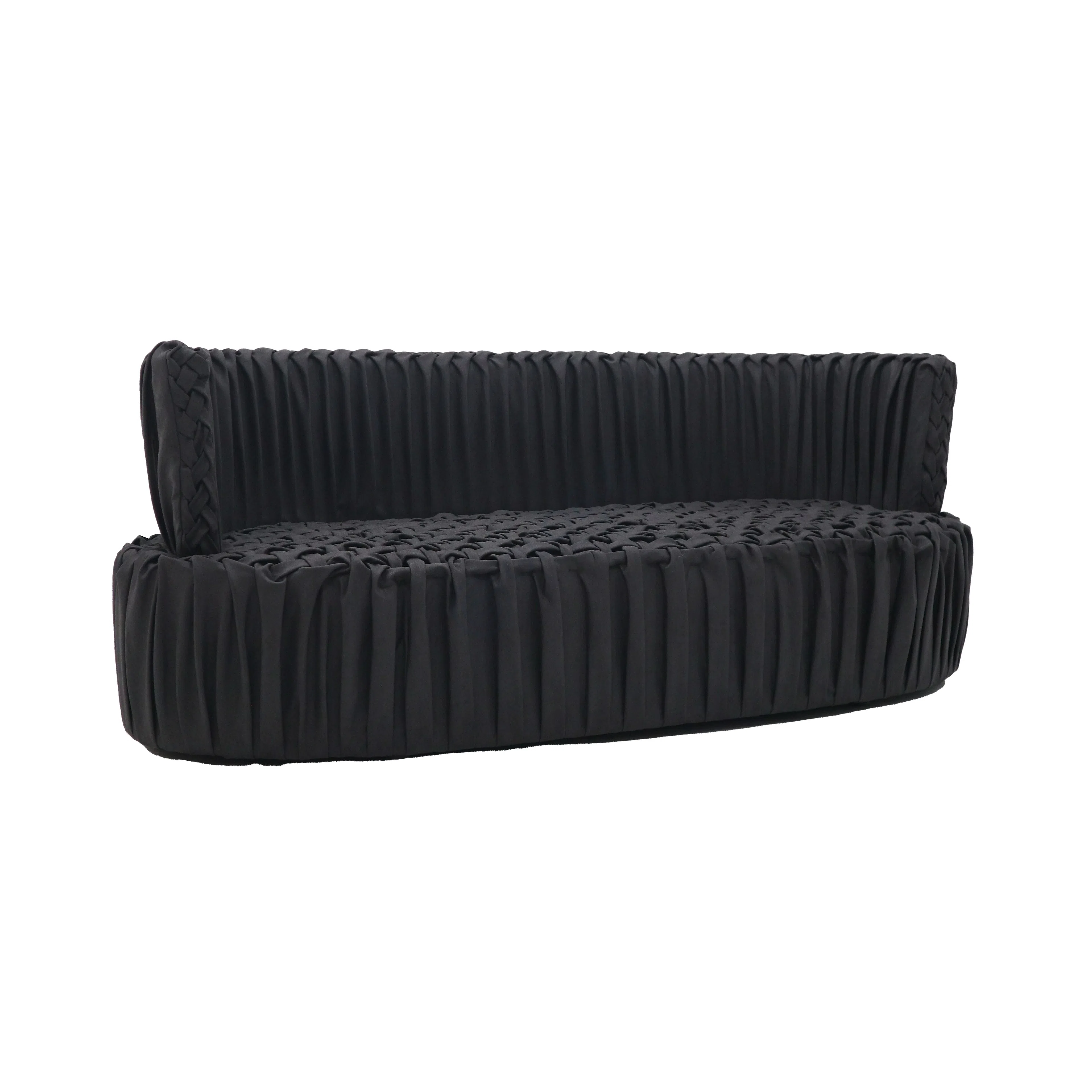 Versatile in its application, the pouf serves as a comfortable extra seat, a footrest, or a stylish accent piece. It is equally at home adding comfort to a living room, a touch of luxury in a bedroom, a welcoming note in a hallway, or practical elegance in a dressing room. Crafted with a sturdy internal structure of solid wood, plywood, and metal, and finished with high-quality upholstery that includes exquisite suede leather components, this pouf is designed for both beauty and lasting durability.