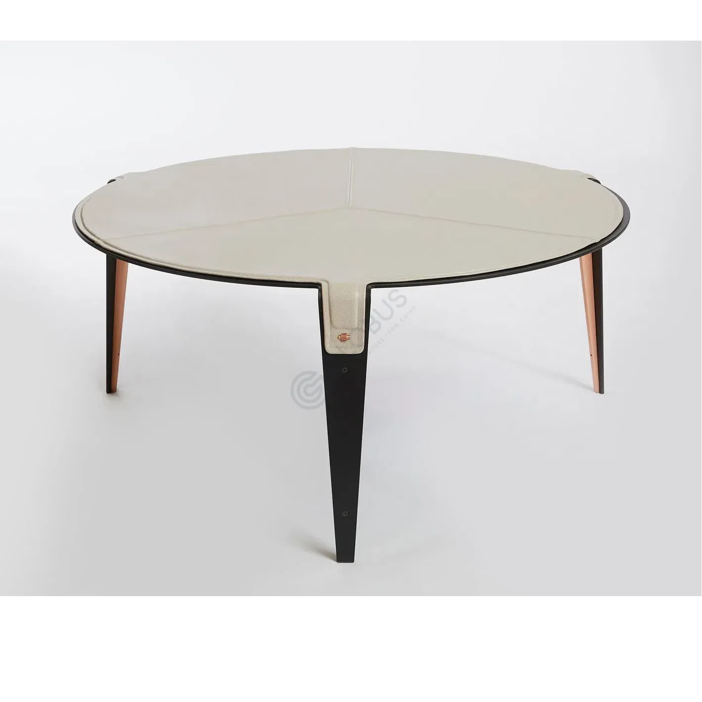 This side table features a refined combination of materials, showcasing a circular surface crafted from soft suede leather. The top is divided into sections by subtle stitching, creating a unique visual pattern.