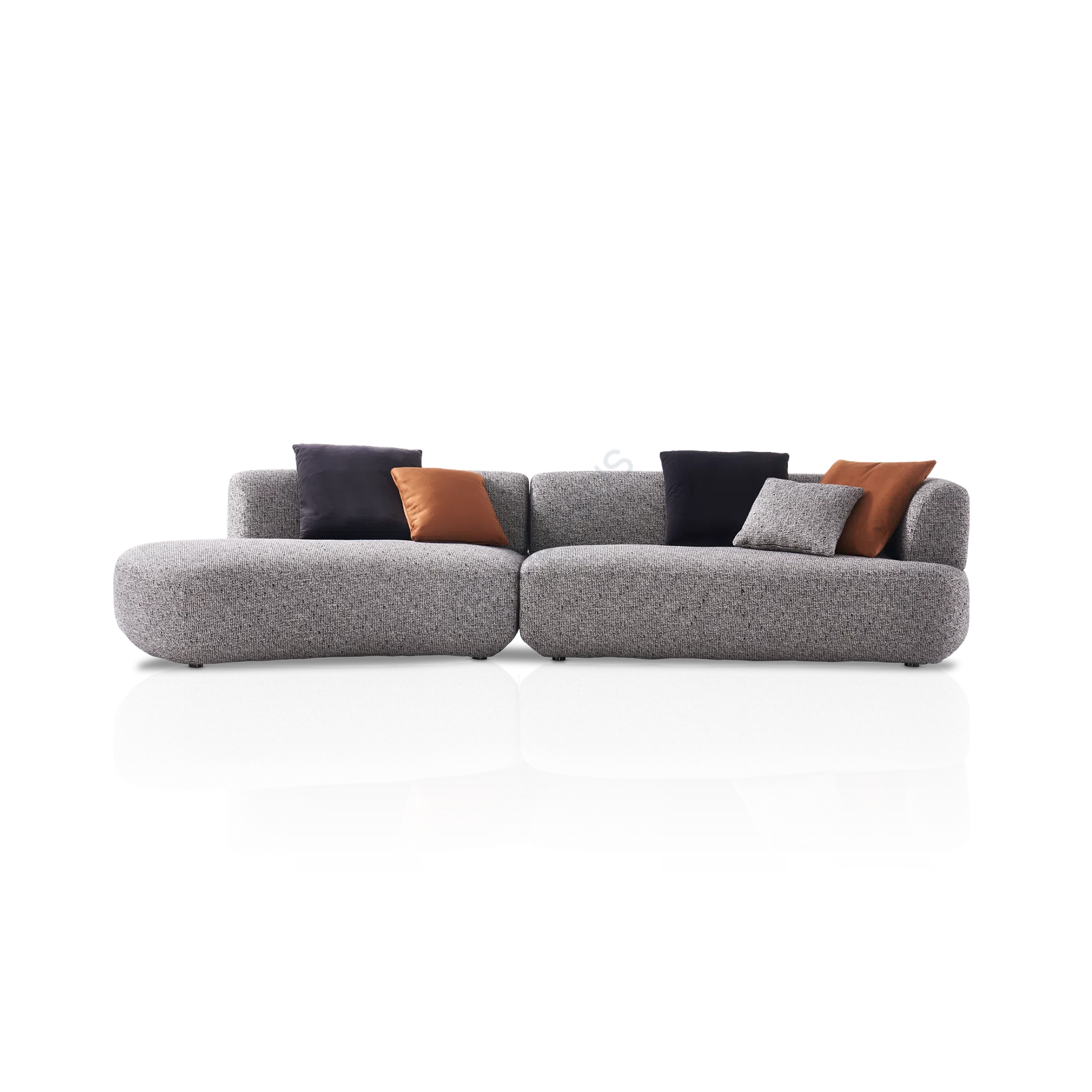 This modern sofa presents an inviting silhouette, characterized by its gently rounded arms and deep, comfortable seating pads. Upholstered in soft suede leather, it offers a luxurious touch and a sophisticated appearance that complements any contemporary living space.