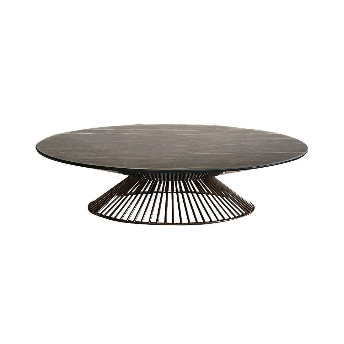 The base provides a strong visual anchor with its elegant, conical shape. Constructed from iron rods in a black finish, these vertical elements create a dynamic, cage-like structure that is both airy and stable.