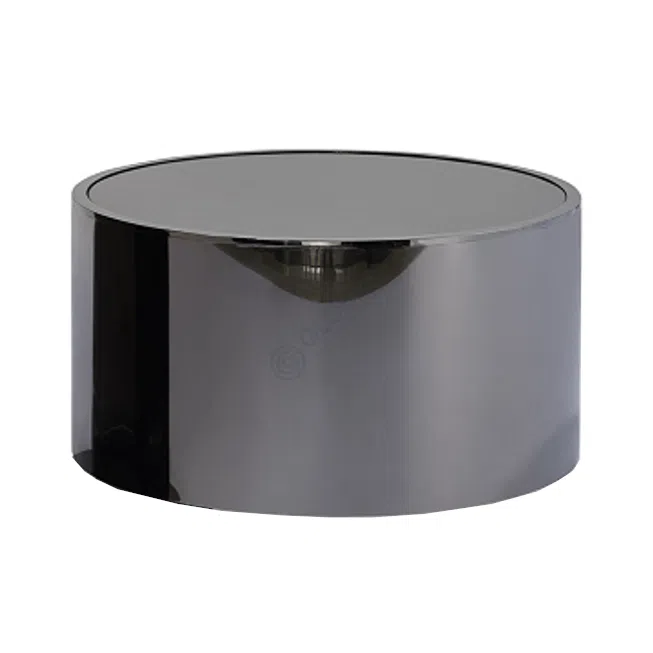 This modern coffee table presents a compelling cylindrical silhouette. Its base is crafted from polished stainless steel, offering a smooth, reflective surface that captures light and shadow. Topping this strong form is a substantial surface made of artificial marble, featuring a refined pattern that brings a touch of natural elegance.