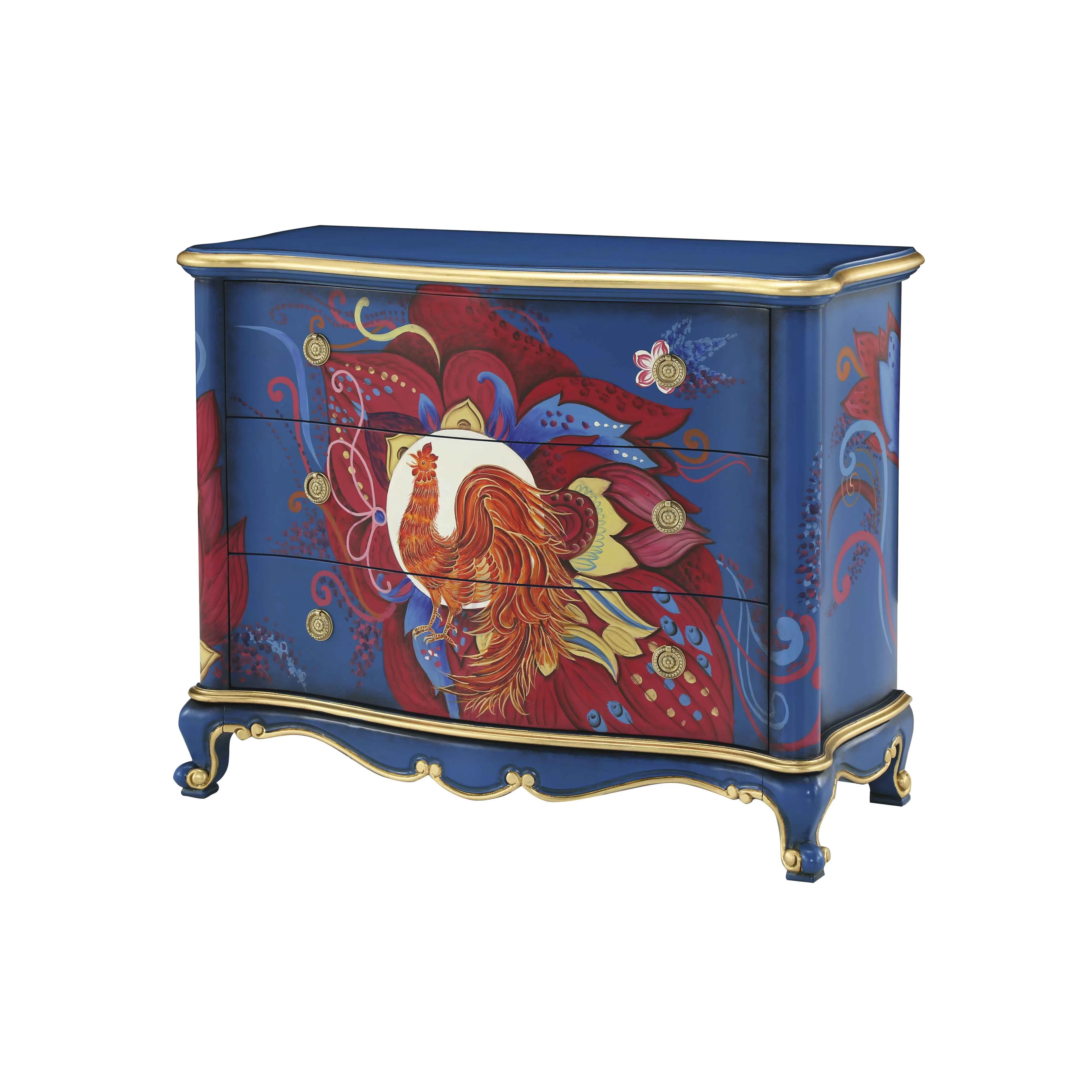 A distinctive dresser designed in the European classic style presents a gracefully curved form. It features a rich, dark finish adorned with an elaborate golden botanical motif covering its surface. Delicate floral and vine details flow across the drawer fronts and sides, highlighting the elegant shape of the piece. The subtly shaped top complements the overall sophisticated aesthetic.