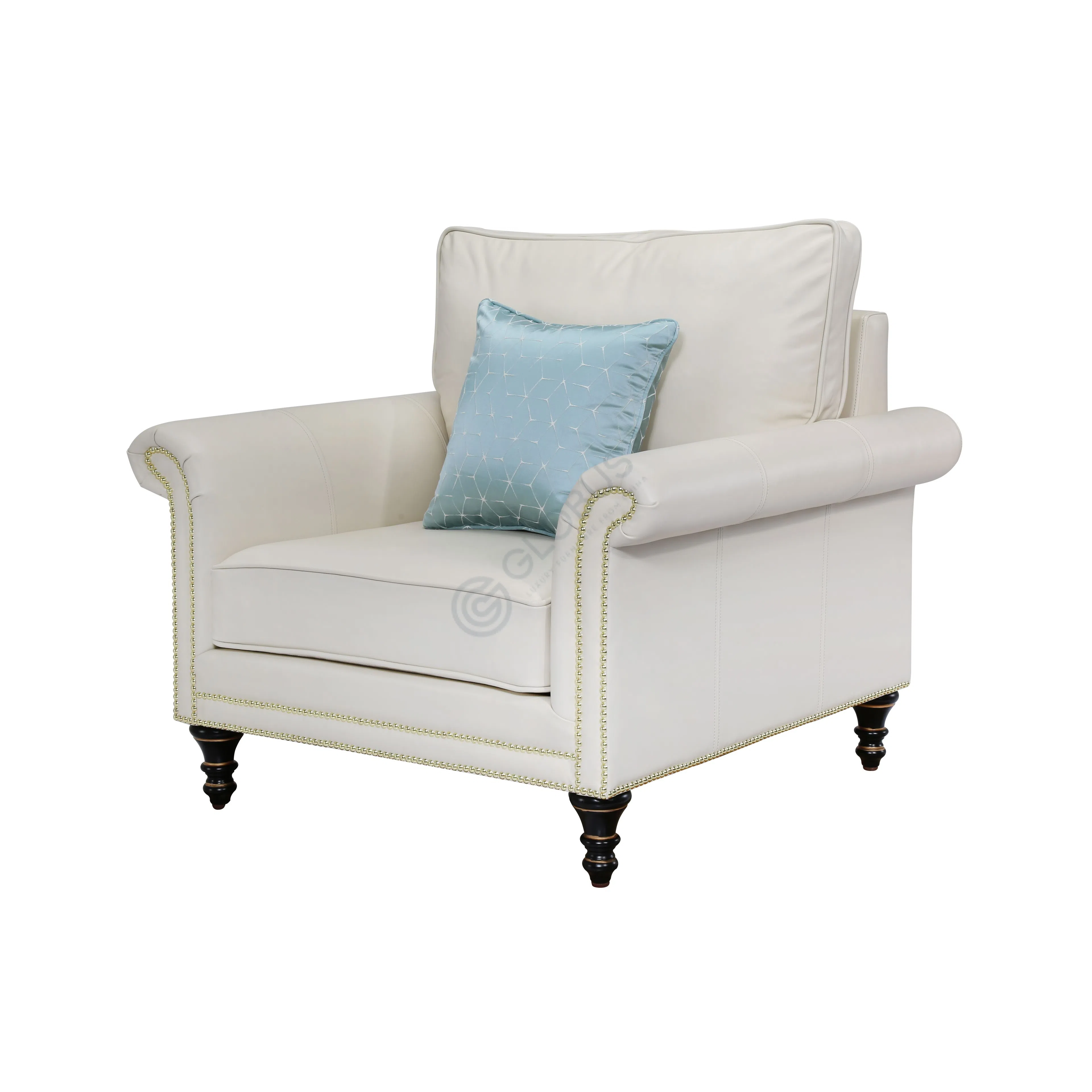 Crafted with a sturdy frame using solid wood and MDF, this piece ensures lasting durability. The plush textile upholstery provides a soft touch and inviting feel. Rolled arms contribute to the traditional silhouette, while carefully applied nailhead trim along the base and arms adds a touch of bespoke craftsmanship. The turned legs, made from solid wood, provide a classic foundation.