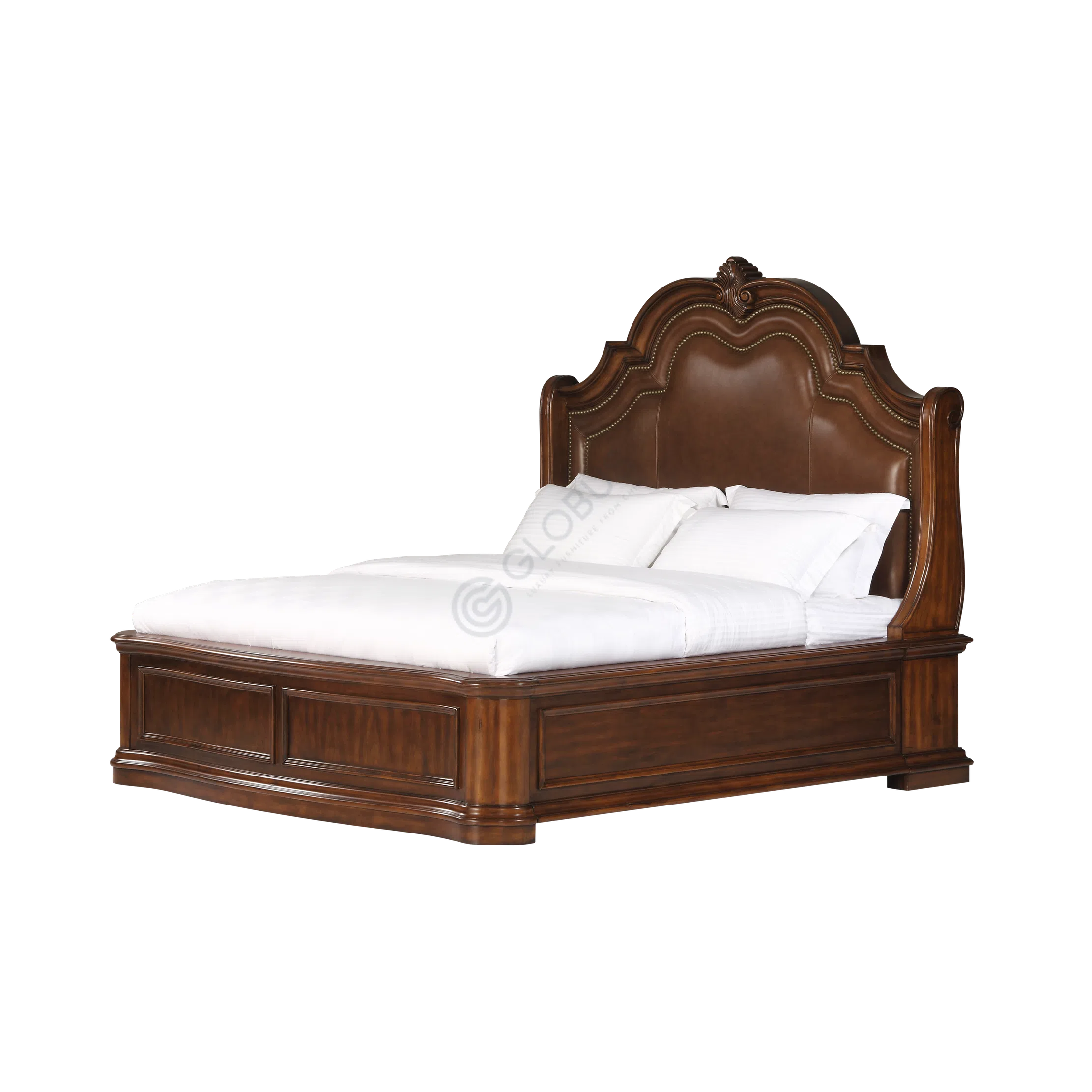 The bed frame base complements the headboard's aesthetic. Constructed using solid wood and MDF, it provides a sturdy foundation with a finished appearance. The base features panel detailing and rests on elegant feet, completing the sophisticated look. The careful selection and combination of leather, wood, metal, and MDF contribute to the bed's substantial presence and classic character.