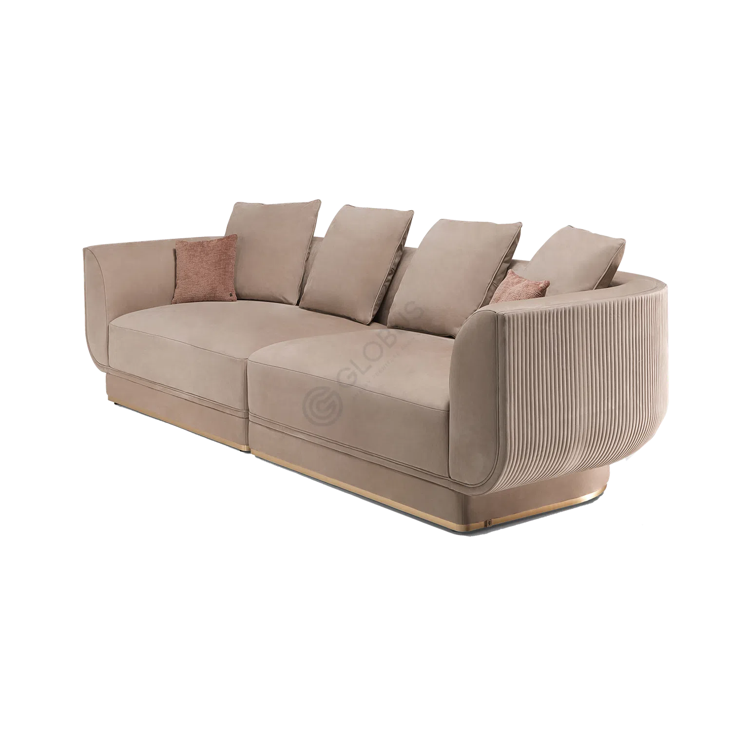 The structure is built upon a durable frame crafted from solid wood and plywood, ensuring stability and longevity. A polished stainless steel detail accents the base, providing a subtle line of contemporary shine that enhances the overall aesthetic. One arm features a distinctive vertical ribbed texture, adding a unique visual element and craftsmanship detail.