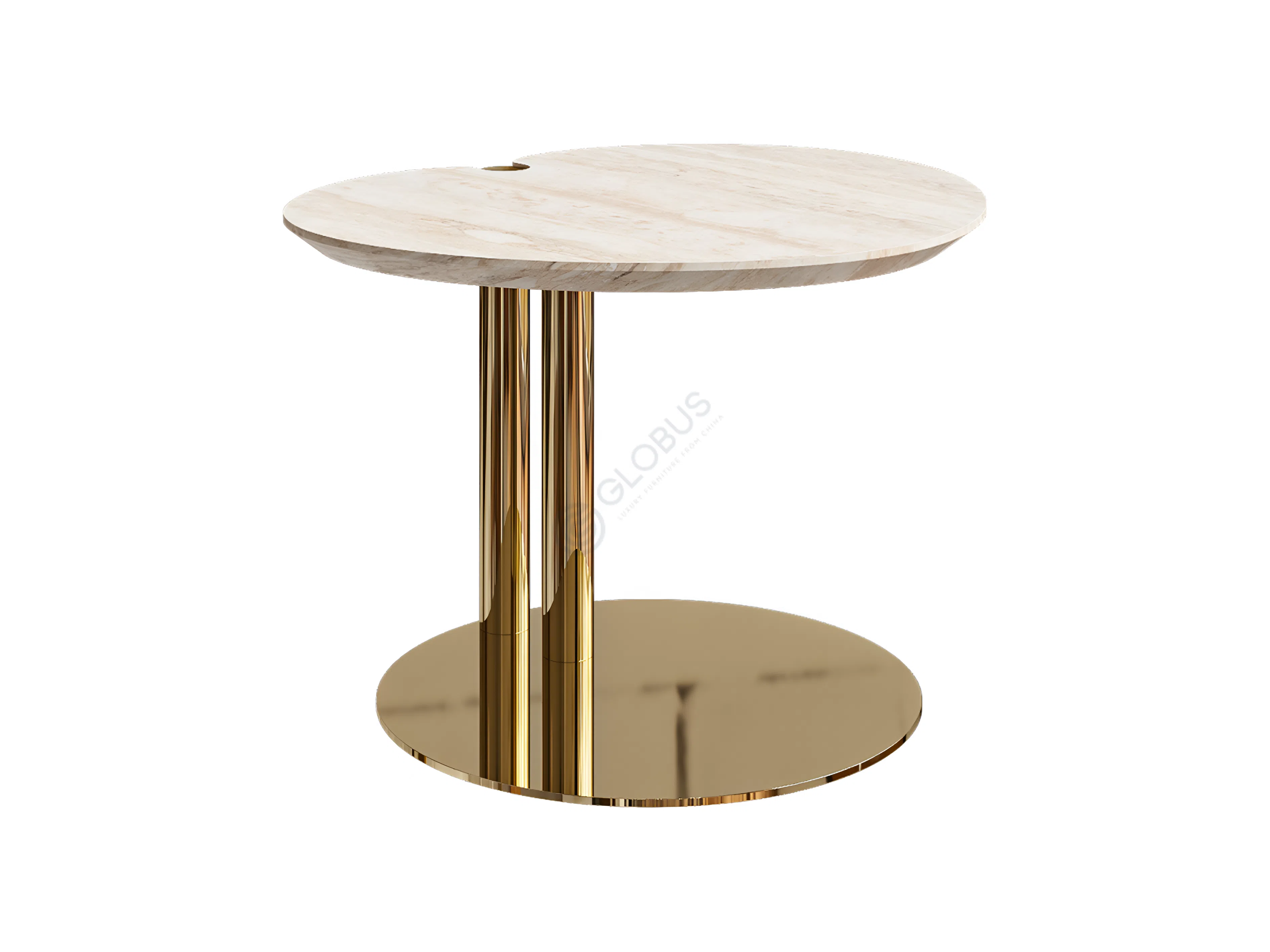 The table features a beautiful round top of natural marble, displaying unique and subtle veining that highlights its organic beauty and authenticity. This luxurious stone is supported by a sleek base of gleaming stainless steel, meticulously polished to a mirror-like finish that reflects light and adds a luminous quality. The combination of the marble's tactile texture and the metal's smooth sheen creates a compelling visual harmony.