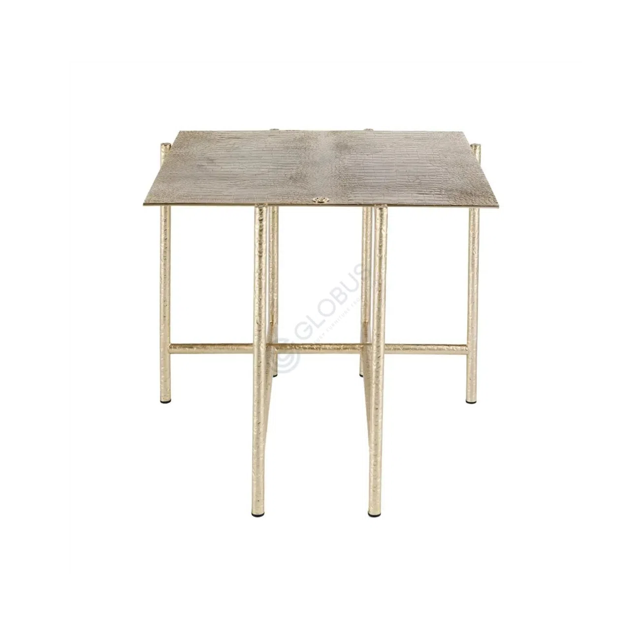 Crafted entirely from aluminum, the side table pairs durability with a lightweight feel. Its warm gold finish carries a gentle patina, accentuating the textured pattern and catching light at varying angles. Resistant to corrosion and scratches, the surface remains easy to clean and maintain over time.