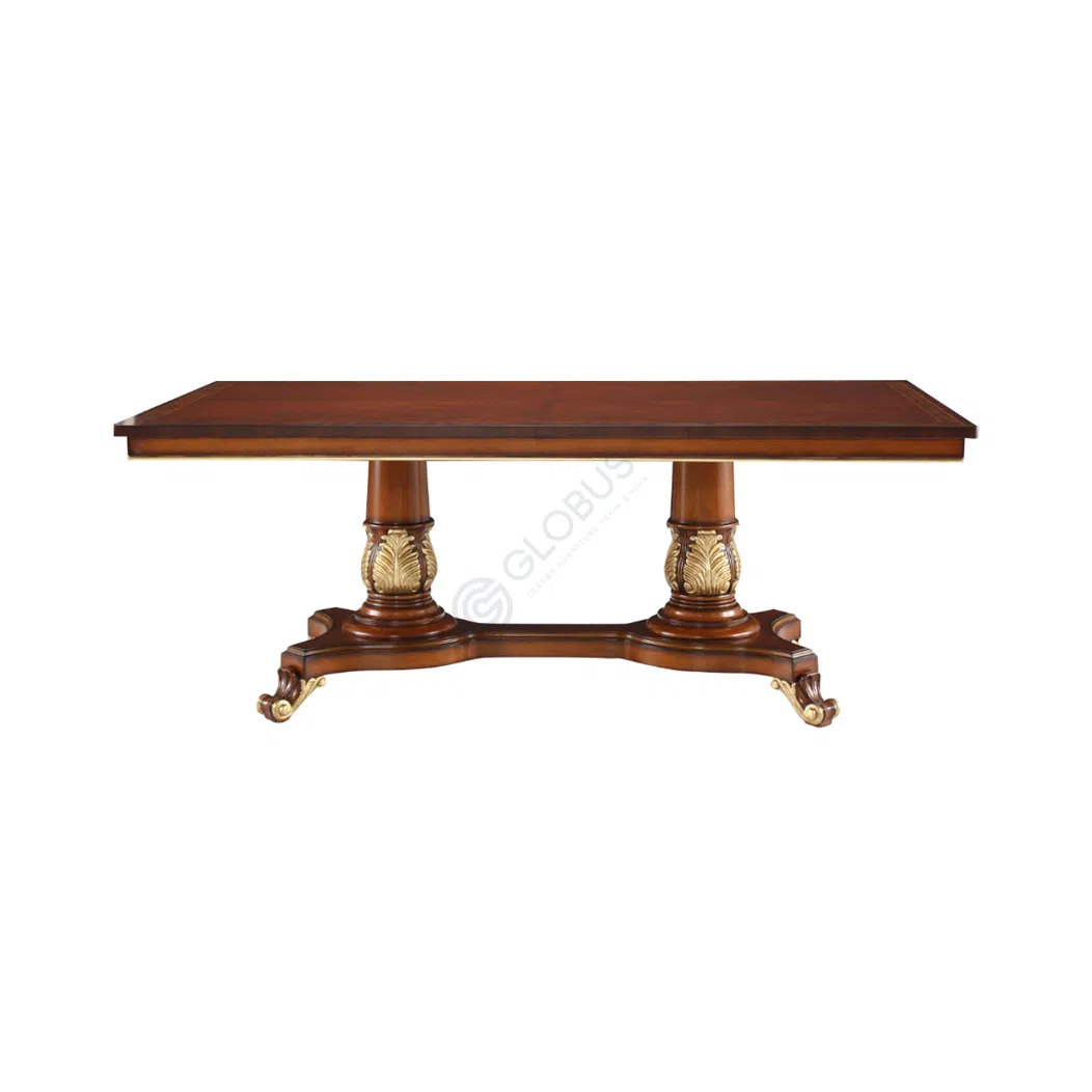 Introducing our exquisite dining table, exuding European classic charm, perfect for your dining room or kitchen space. This masterfully crafted piece combines solid wood, MDF, and natural veneer, accentuated by a gentle patina finish. With its timeless design and superior craftsmanship, this table offers both elegance and functionality, elevating any dining experience to new heights. Create lasting memories around this remarkable centerpiece.