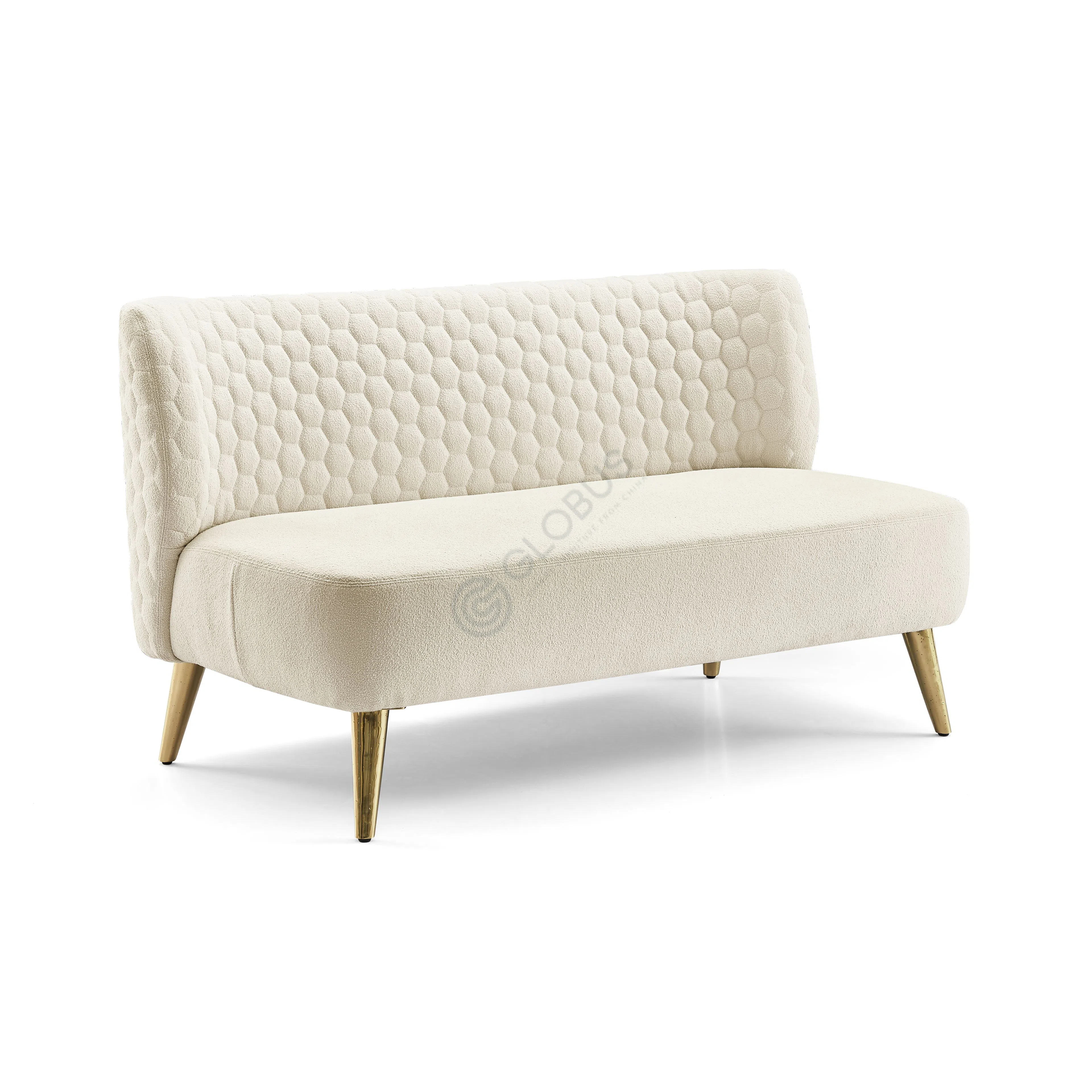 The piece is upholstered in a quality textile, with a distinct textured pattern adorning the backrest that adds visual interest and depth. Built with plywood for a sturdy frame, it rests on tapered legs finished with a touch of stainless steel, providing a subtle metallic gleam. This chair offers both comfortable seating and a sophisticated design element.