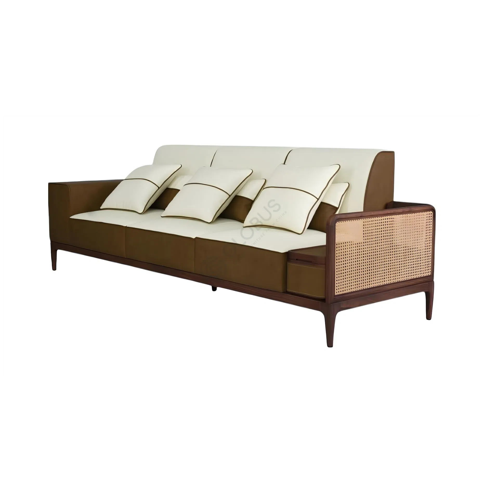 This modern Hermes Sellier armchair embodies the perfect blend of elegance and comfort, making it an ideal addition to any living room. Accentuating this expressive silhouette with clean lines is a warm wooden frame in solid wood and plywood, blending stability with style. The seat and back are upholstered in refined leather accented with soft cream-colored cushions, inviting one to linger. Natural rattan panels on the sides add a sophisticated texture that allows subtle light to filter through and makes the overall design airy and refreshing. This Hermes Sellier armchair was designed with generous proportions to present a balanced mix of supportive padding and gentle contours. It seamlessly combines traditional craftsmanship with contemporary aesthetics, providing a comfortable seating experience and an understated, premium look.