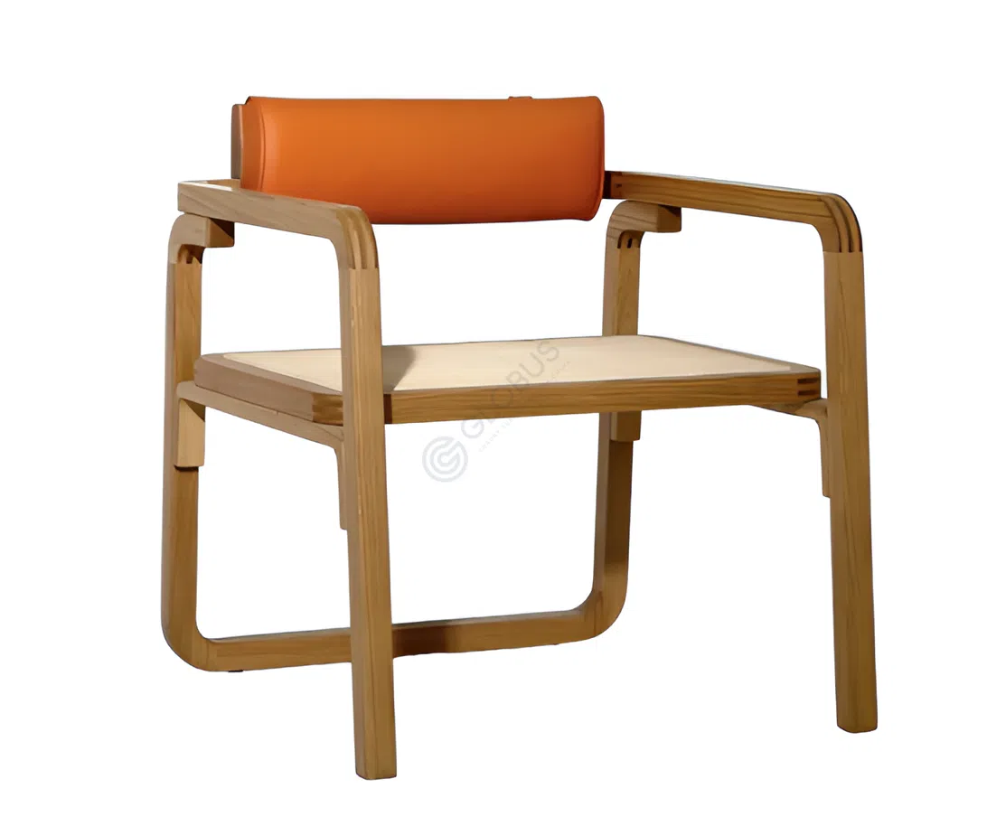 A comfortable cylindrical backrest, upholstered in supple leather, provides a pleasing contrast in both color and material, enhancing the chair's sophisticated appeal. This thoughtful detail ensures supportive seating while adding a warm accent. Versatile in nature, the chair finds its place effortlessly in a living room, home office, or as a distinguished dining chair.