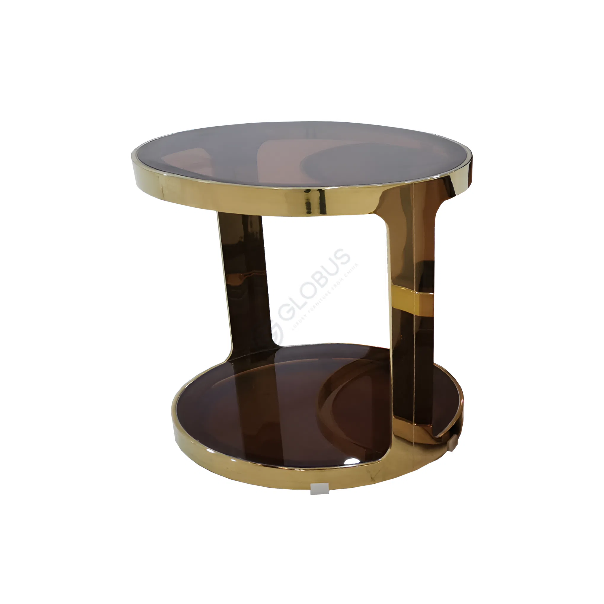 The frame is crafted from stainless steel with a polished gold finish, providing a striking visual contrast to the smoky bronze glass. The oval top tier serves as a refined surface for drinks or display, while the integrated lower shelf offers convenient additional space. A distinct emblem is subtly integrated into the frame, adding a unique touch to its contemporary aesthetic.