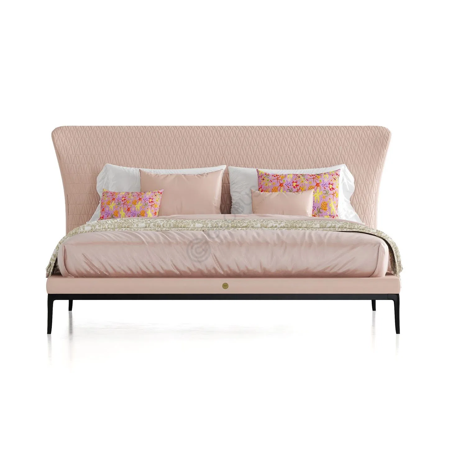 The top surface in honed natural marble contrasts with deep black lacquered veneer on the cabinet body. Front panels combine richly grained natural veneer with a printed textile overlay in gold tones, offering a subtle decorative motif without overwhelming the overall simplicity of the form.