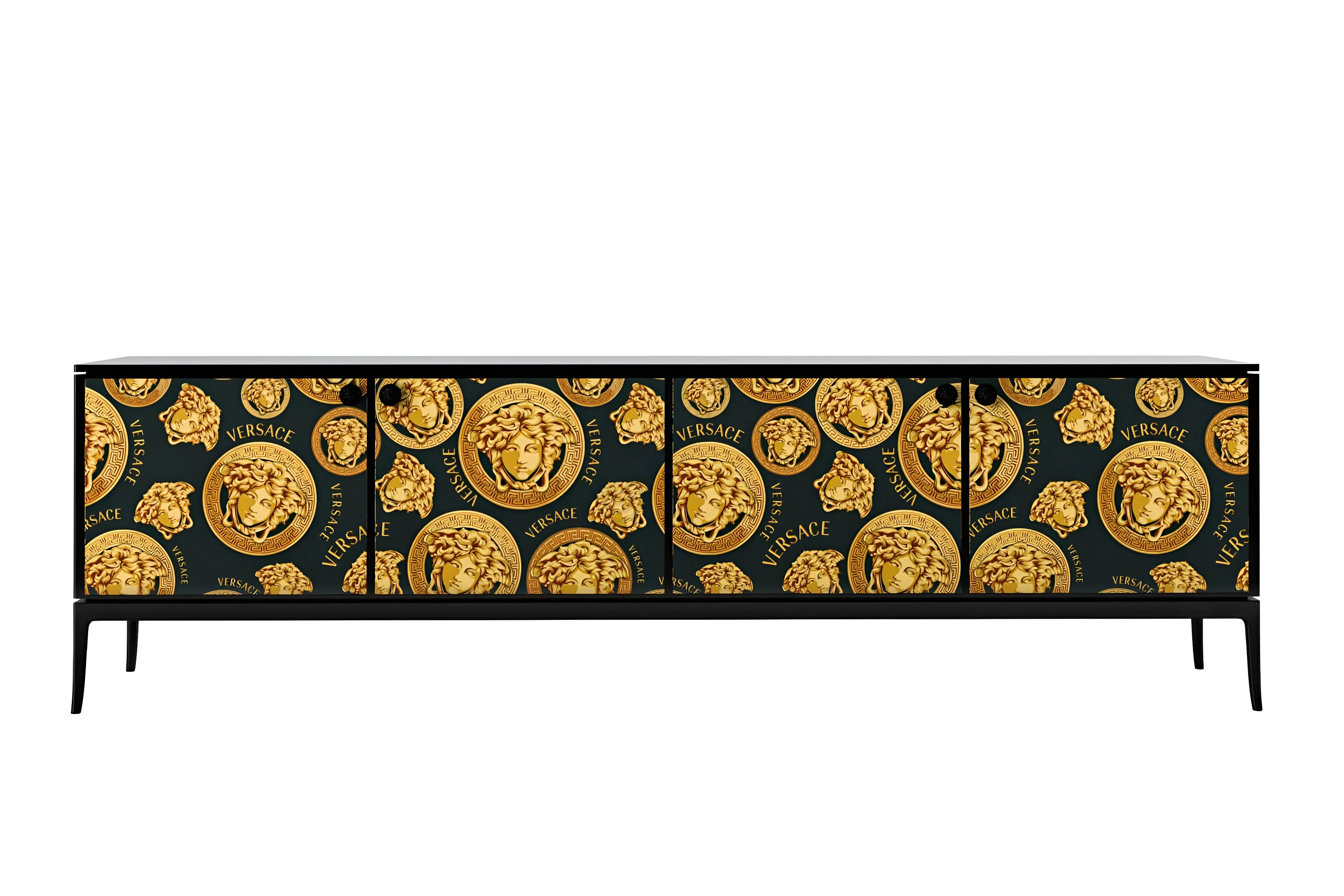 The veneered doors are adorned with a graphic medallion motif in warm gold on deep black, creating a strong focal point without overwhelming the room. The marble top adds a cool, tactile counterpoint and features unique veining that makes each piece subtly distinct.