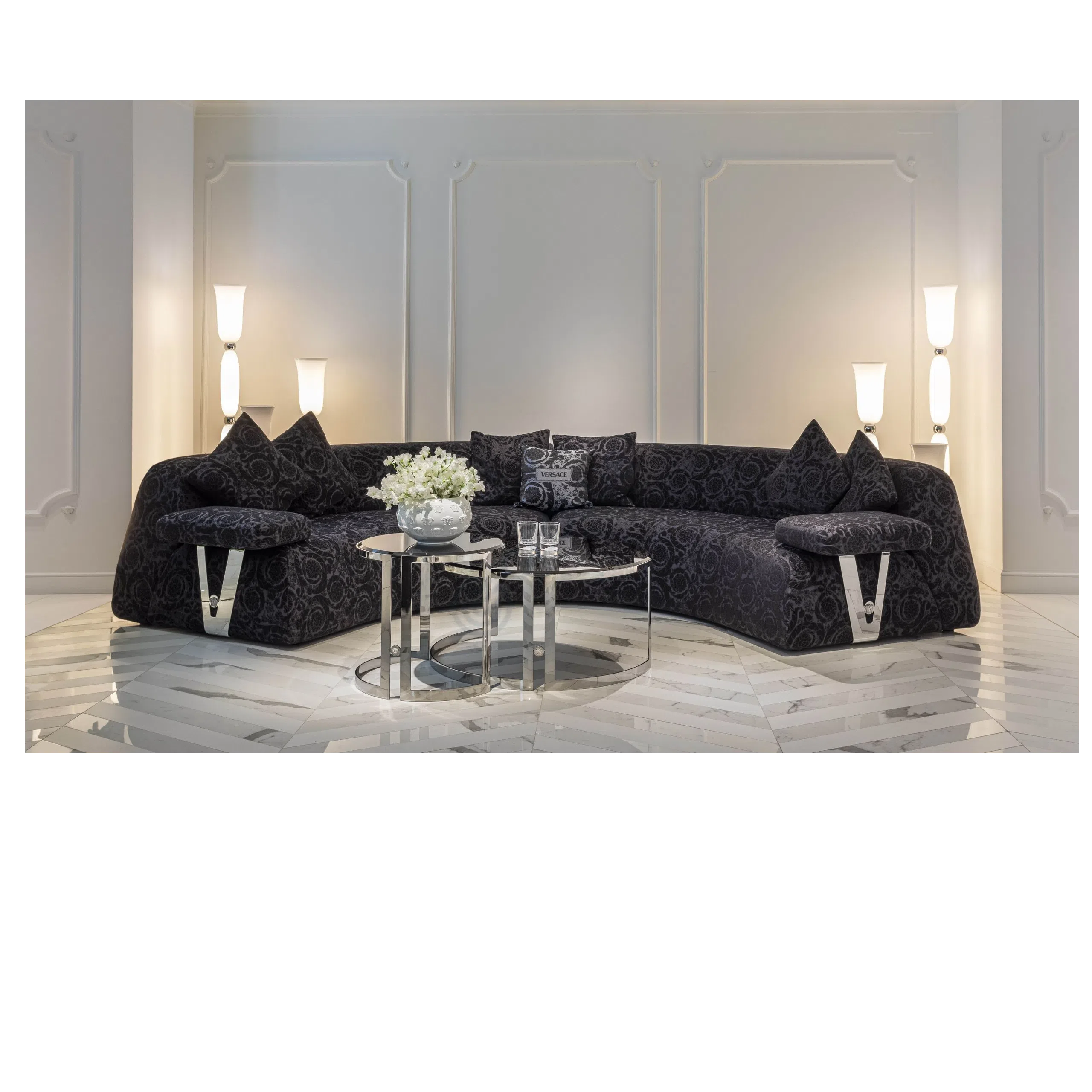 Designed with a modern aesthetic, this piece effectively blends luxurious materials with clean lines and a sophisticated silhouette. It serves as a functional and stylish element positioned next to seating in a living room setting.