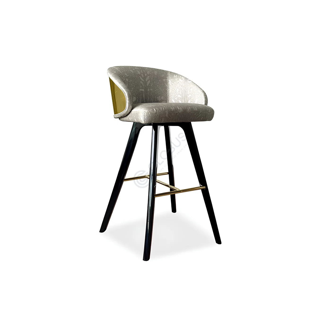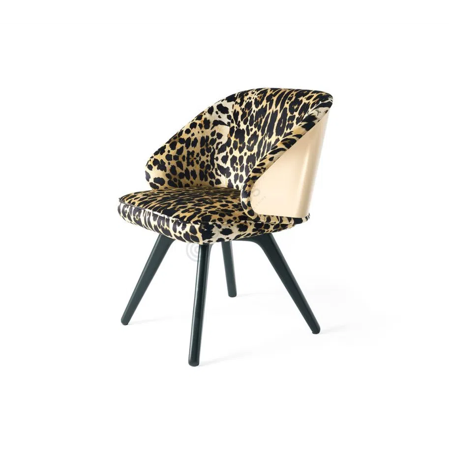 Crafted on a solid wood and plywood frame, the chair’s outer shell is finished in a smooth light-toned veneer that contrasts the patterned fabric. A slender stainless steel base supports the structure, its dark powder coat lending visual lightness and reliable stability.