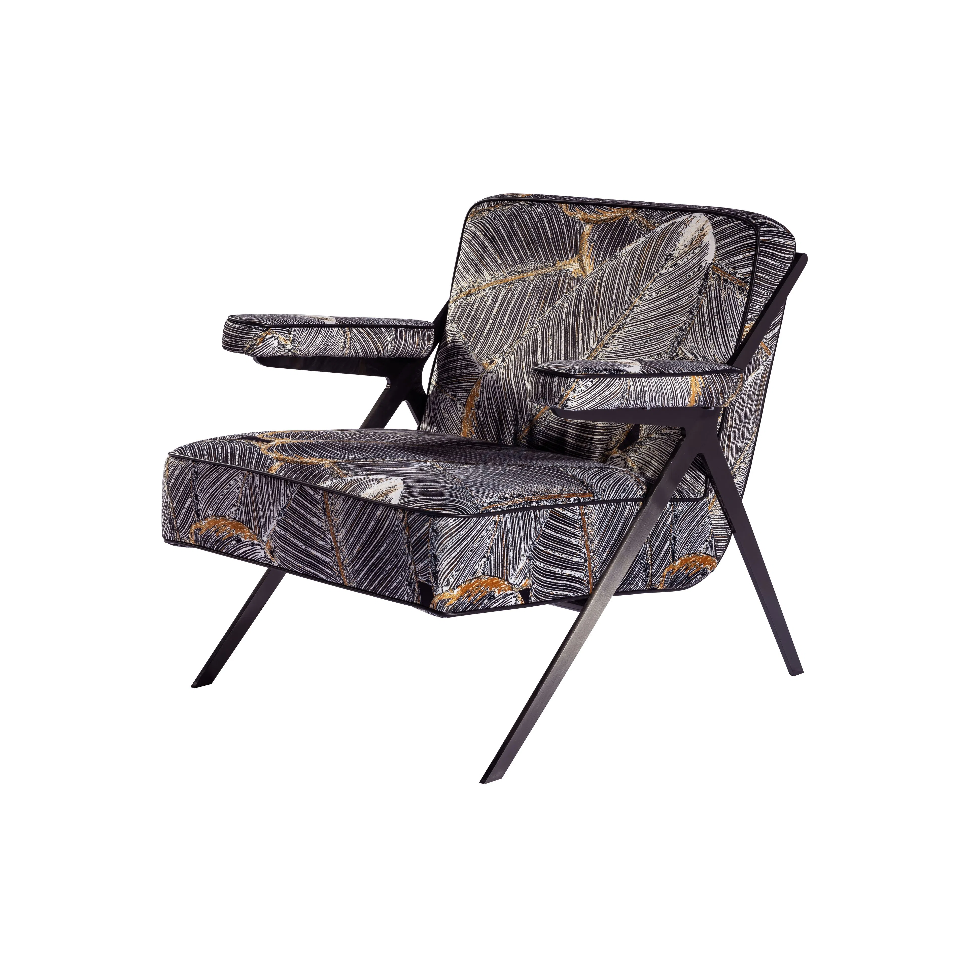 The chair features a strong stainless steel frame, presented in a polished gold finish that provides a warm, sophisticated gleam. Its slender, angular legs create a compelling silhouette, while the armrests are thoughtfully designed with comfortable support.