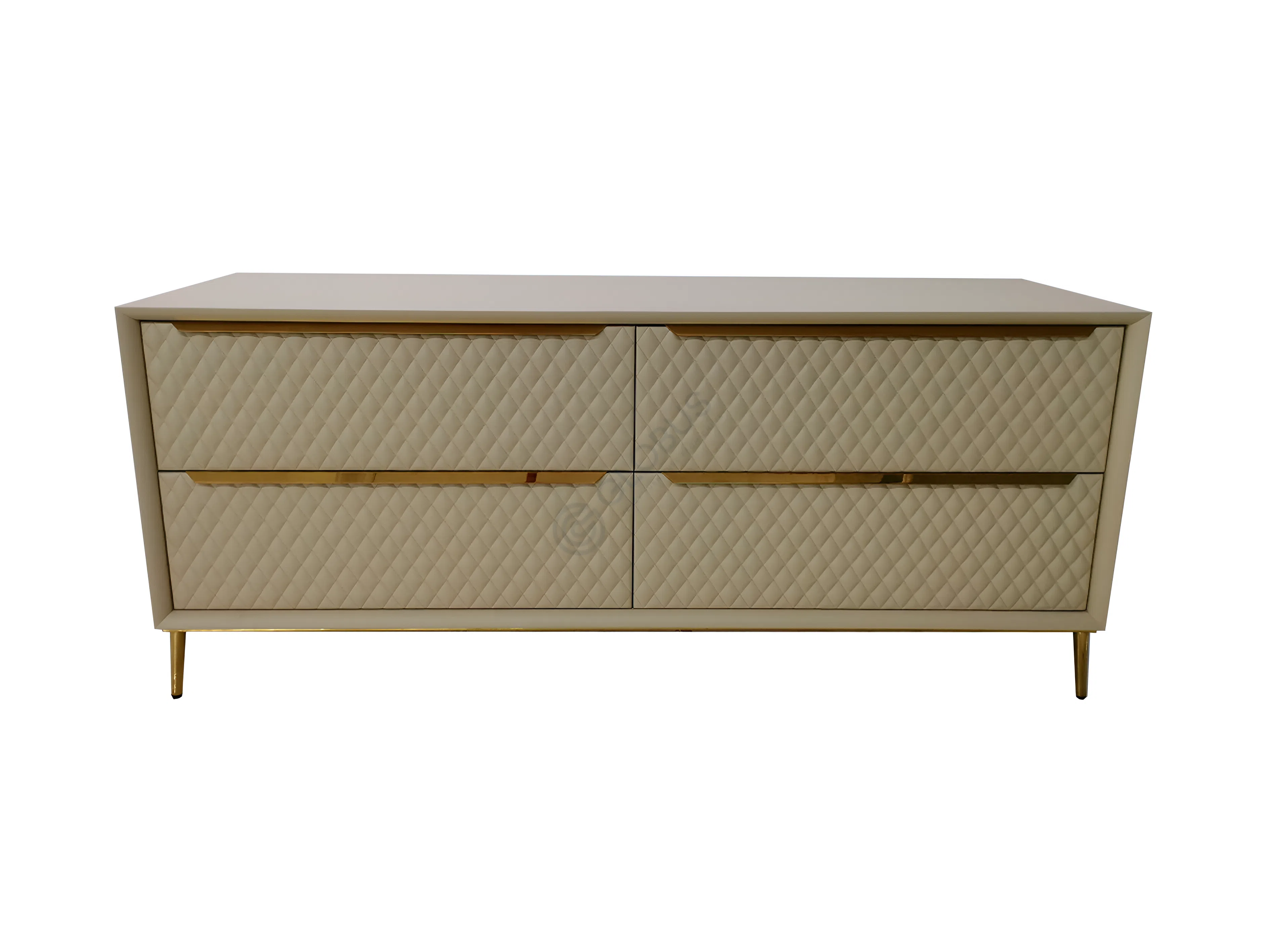 The cabinet is meticulously constructed from durable plywood, providing a sturdy framework. Its four doors are beautifully upholstered in quilted microfiber leather, featuring a delicate diamond pattern that adds a touch of texture and softness. Subtle stainless steel handles are integrated seamlessly, enhancing the clean lines of the design. The structure rests on minimalist legs, completing its elegant appearance, while copper elements contribute to the cabinet's refined composition.