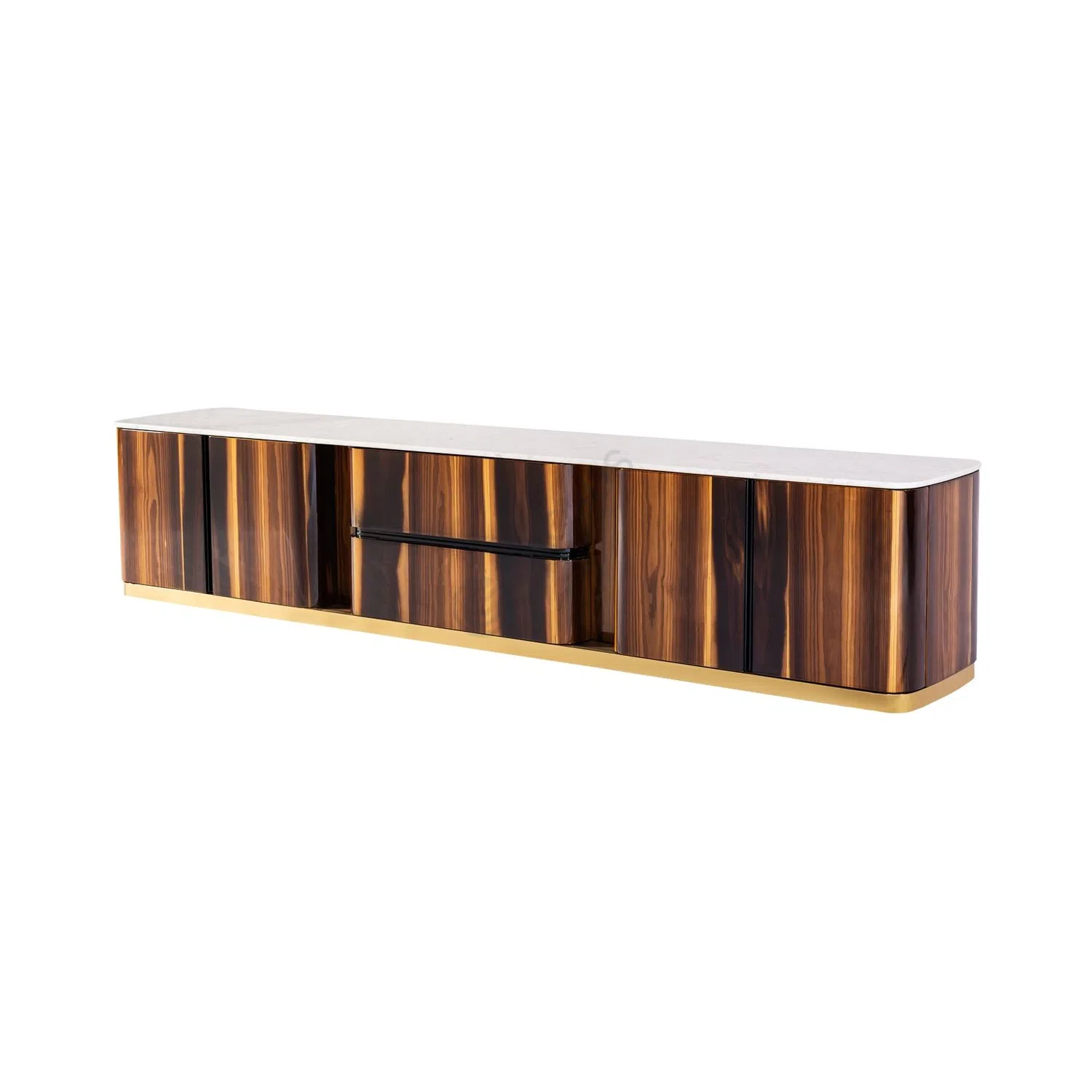 This modern sideboard presents a sophisticated aesthetic, blending rich materials and refined design. A substantial top of natural marble provides a cool, elegant surface, while the main body is constructed from solid wood and plywood, expertly finished with a natural wood veneer that highlights the beauty of its grain. Subtle metal elements are incorporated, adding a touch of contemporary precision.